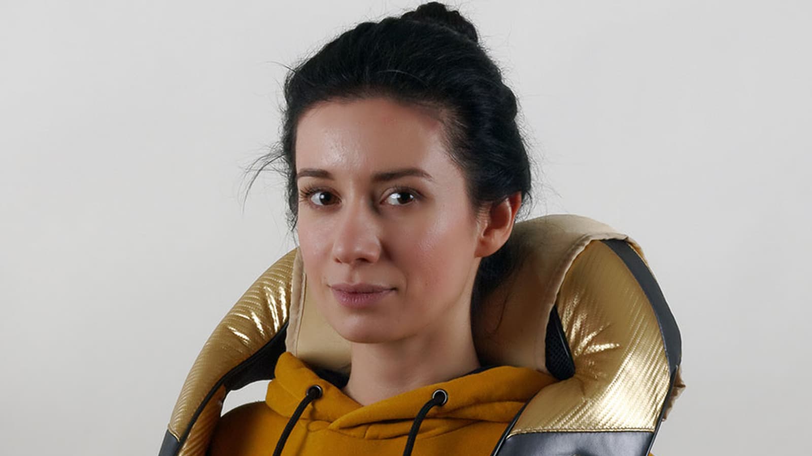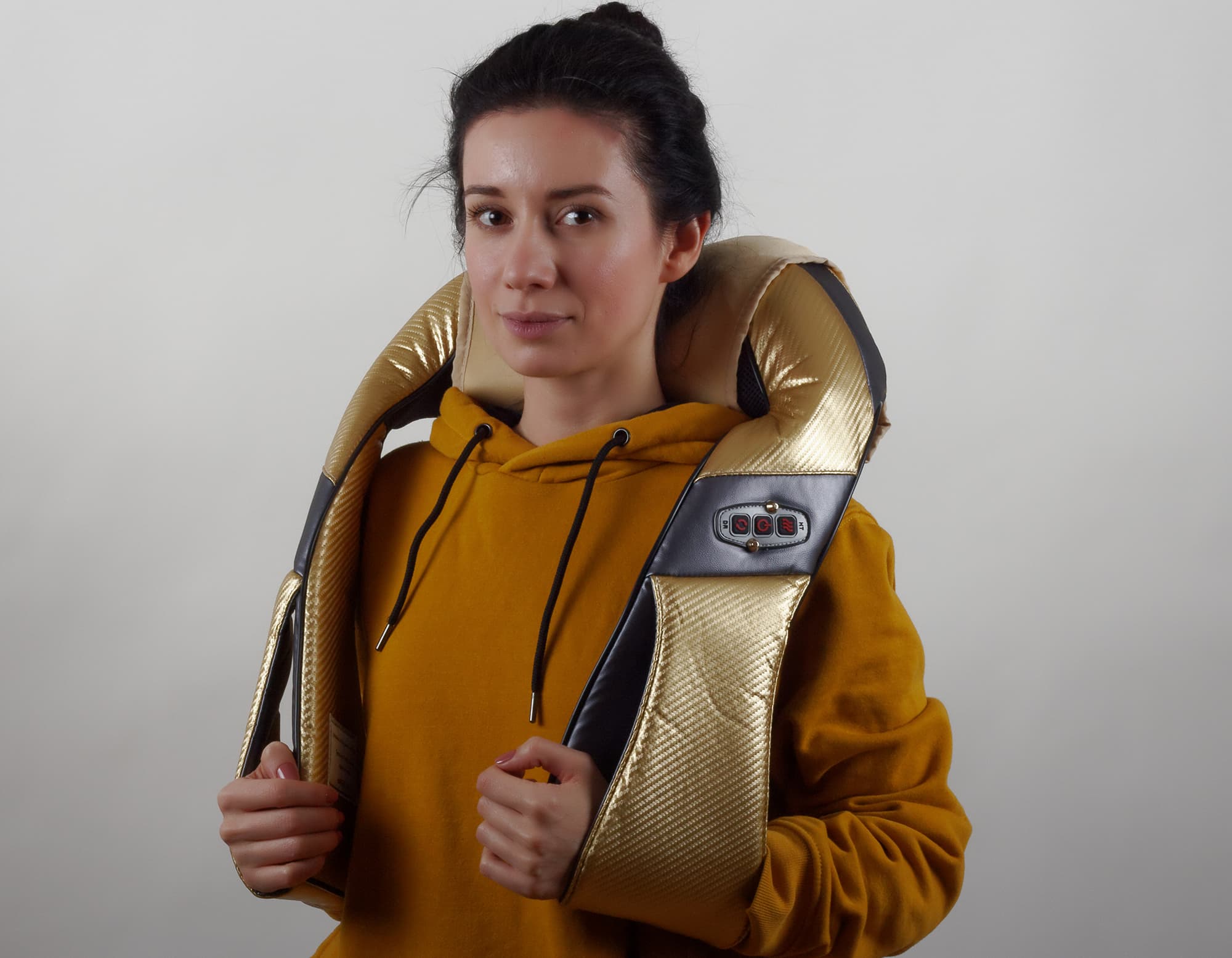 Устройство показалось нам достаточно тяжелым — и то правда, 1,7 килограмма на шее ощущается весомо. Оно напоминает по форме подкову, в центральной части которой находится, собственно, массажный блок, а края — это петли для регулировки прилегания основной части к телу.