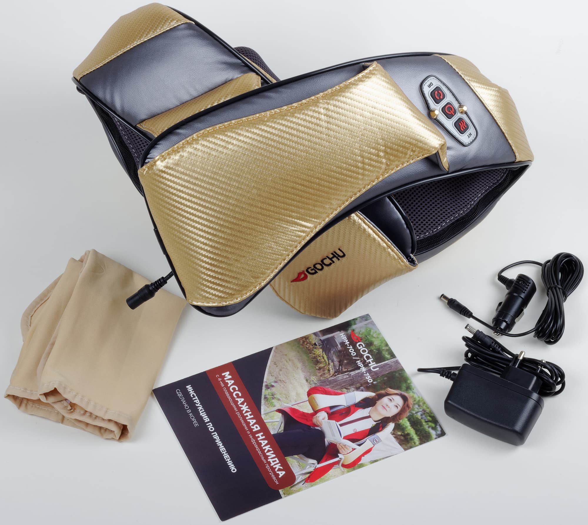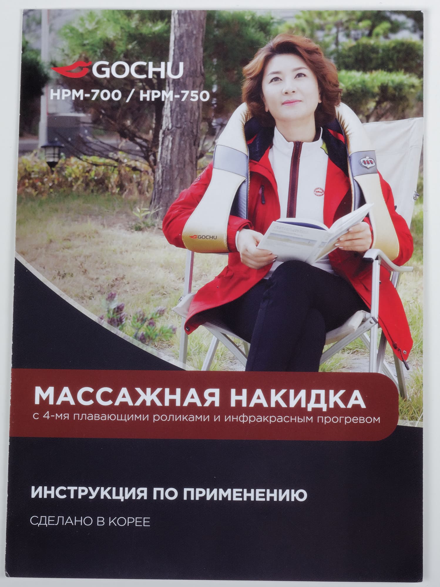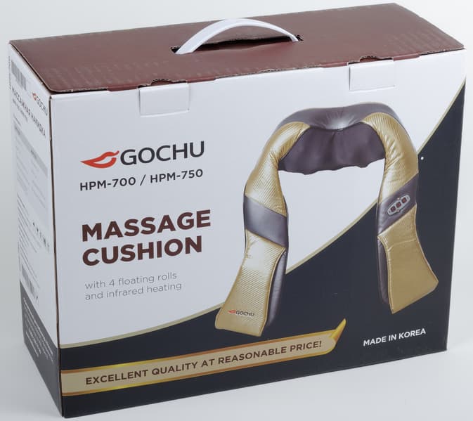 Рядом с дамой нарисована массажная накидка, как называет производитель свой прибор, и перечислены ее основные качества: 4 плавающих ролика и инфракрасный подогрев. Ну и что сделан прибор в Корее — это, с точки зрения производителя, заслуживает быть вынесенным на переднюю панель. Мы видим на коробке, что в ней может находиться как модель HPM-700, так и HPM-750, но в чем разница — пока непонятно.