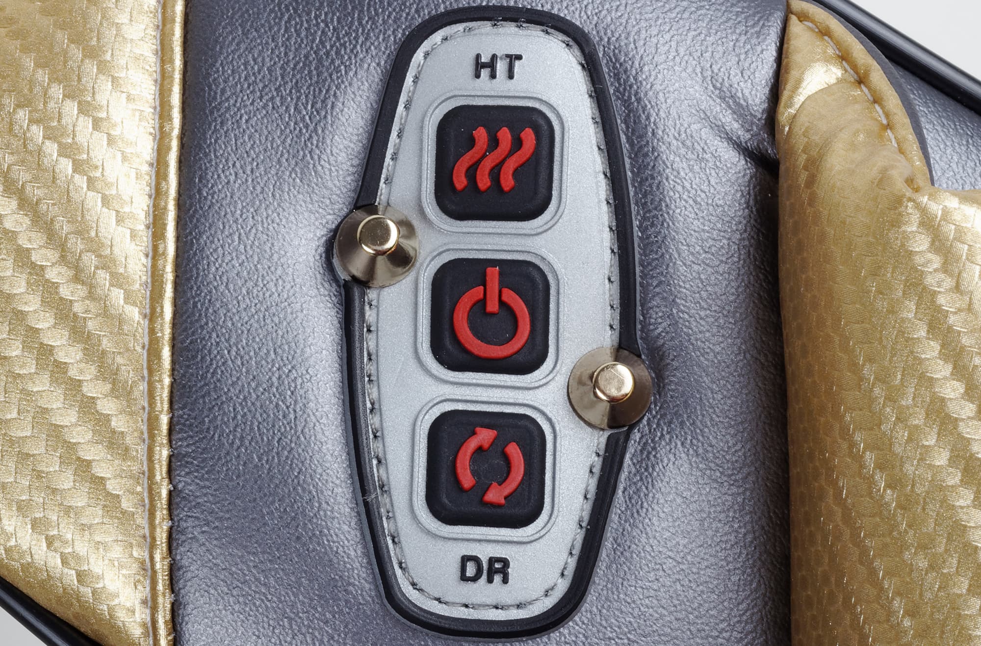Кнопки прорезиненные черные, с выпуклыми красными символами на каждой. Нажимаются они легко, с еле слышным щелчком. Ряд кнопок расположен горизонтально с небольшим скосом и состоит из трех элементов: средняя включает и выключает прибор, правая — инфракрасный нагрев, а левая меняет направление движения роликов. Для правой и левой кнопки есть подсказки на краях блока: HT (Heat) для нагрева и DR (Direction) для направления. Но, как нам показалось, символы на кнопках понятны без дополнительных разъяснений.