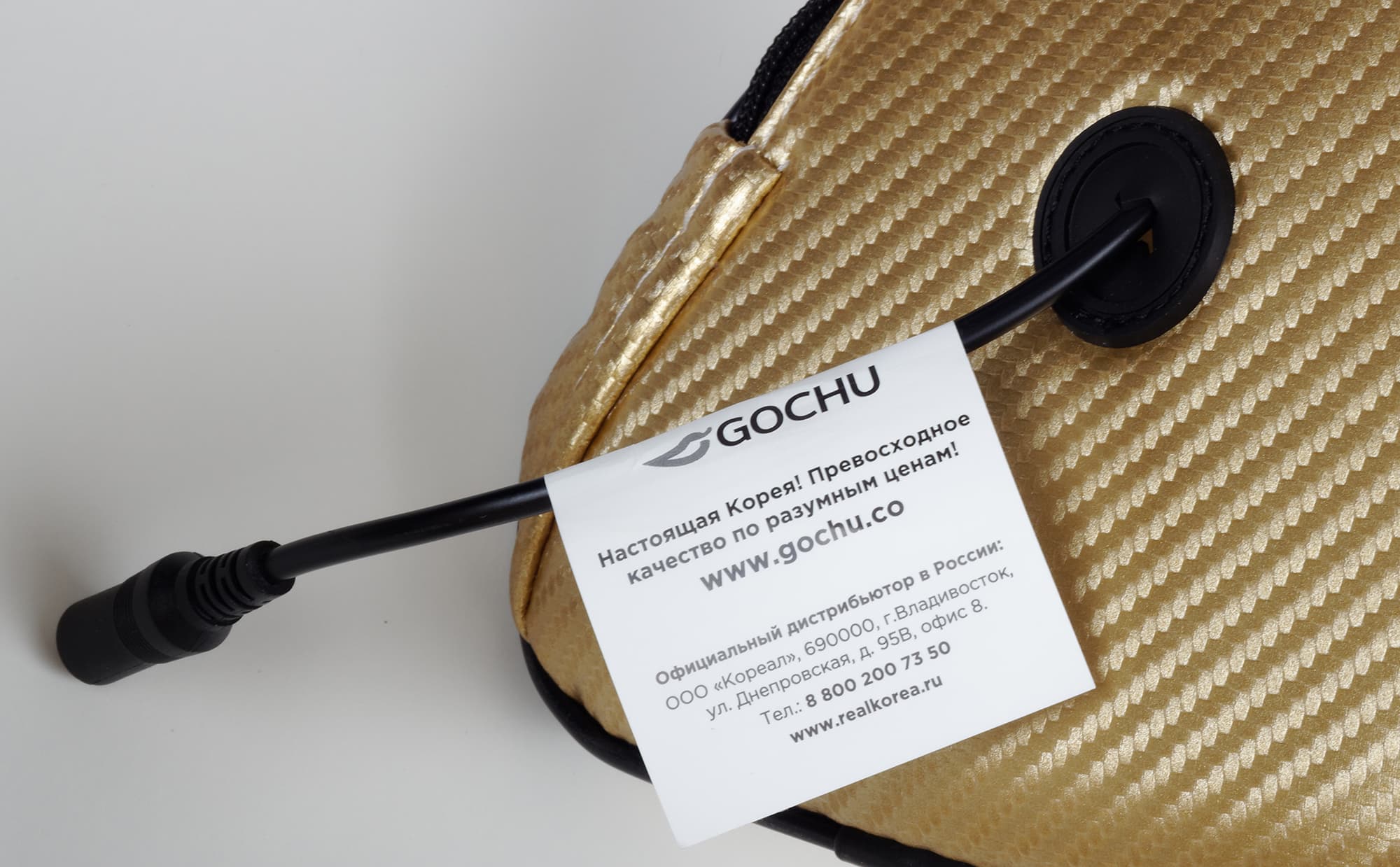 Там же есть некоторые технические сведения: вес, материал покрытия (полиуретан), напряжение и почему-то в самом конце списка — вид массажа (шиацу). На всех сторонах коробки есть сведения о российском дистрибьюторе марки Gochu.