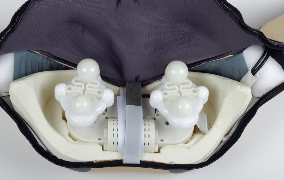 Массажный блок устройства закреплен в корпусе сложной формы, выполненного из пенополиуретана желтоватого цвета, довольно грубой фактуры. Внешний корпус оберегает механизм массажного блока от ударов и сохраняет тепло. Сам блок состоит из двух массажных головок с редукторами и мотором между ними. Аккумулятор размещается в отдельном пластиковом корпусе рядом с мотором.