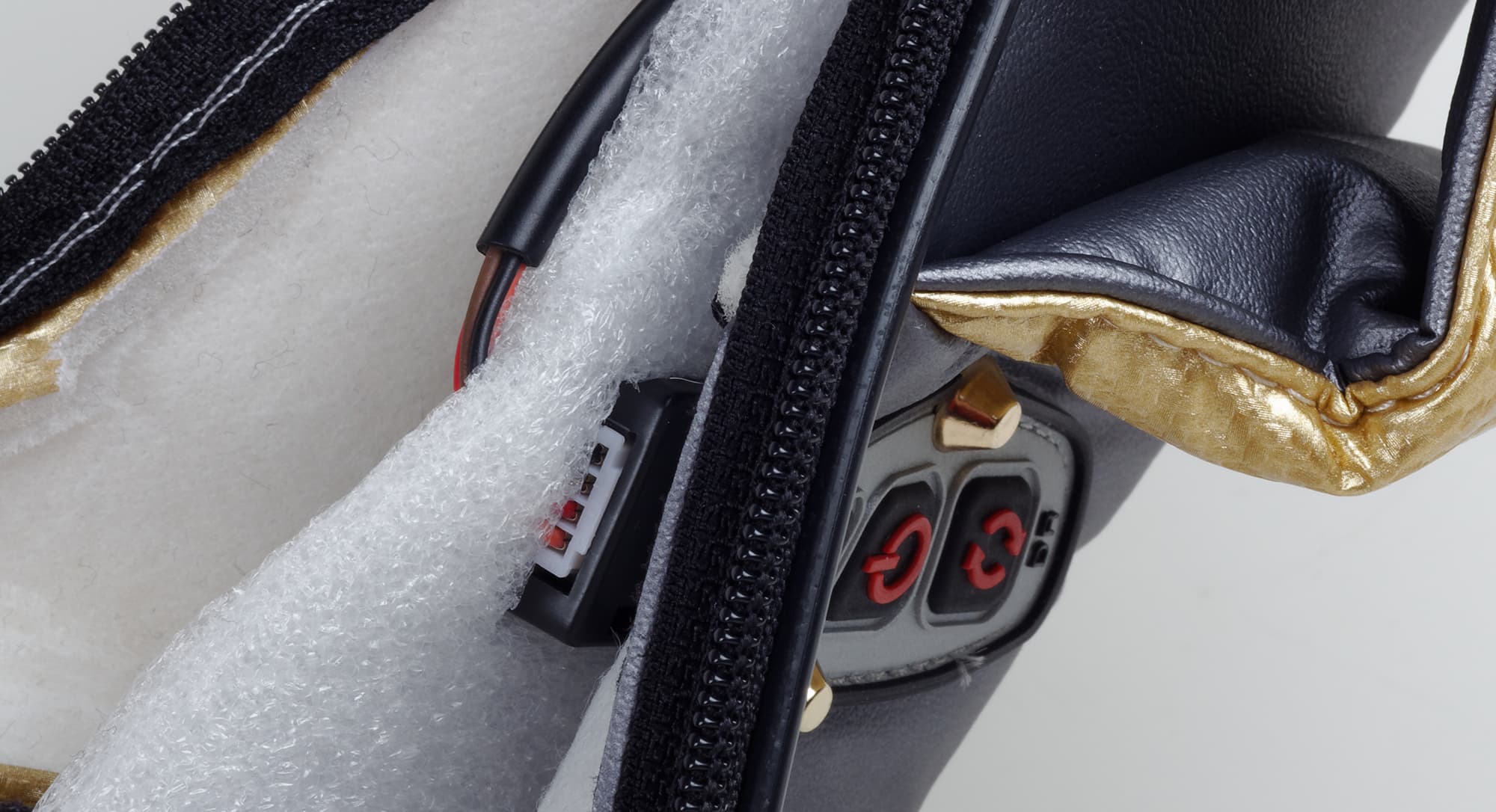 На левой петле в районе плеча расположен блок управления, и в той же петле есть мягкое гнездо для зарядки, из которого торчит небольшой отрезок провода с переходником.