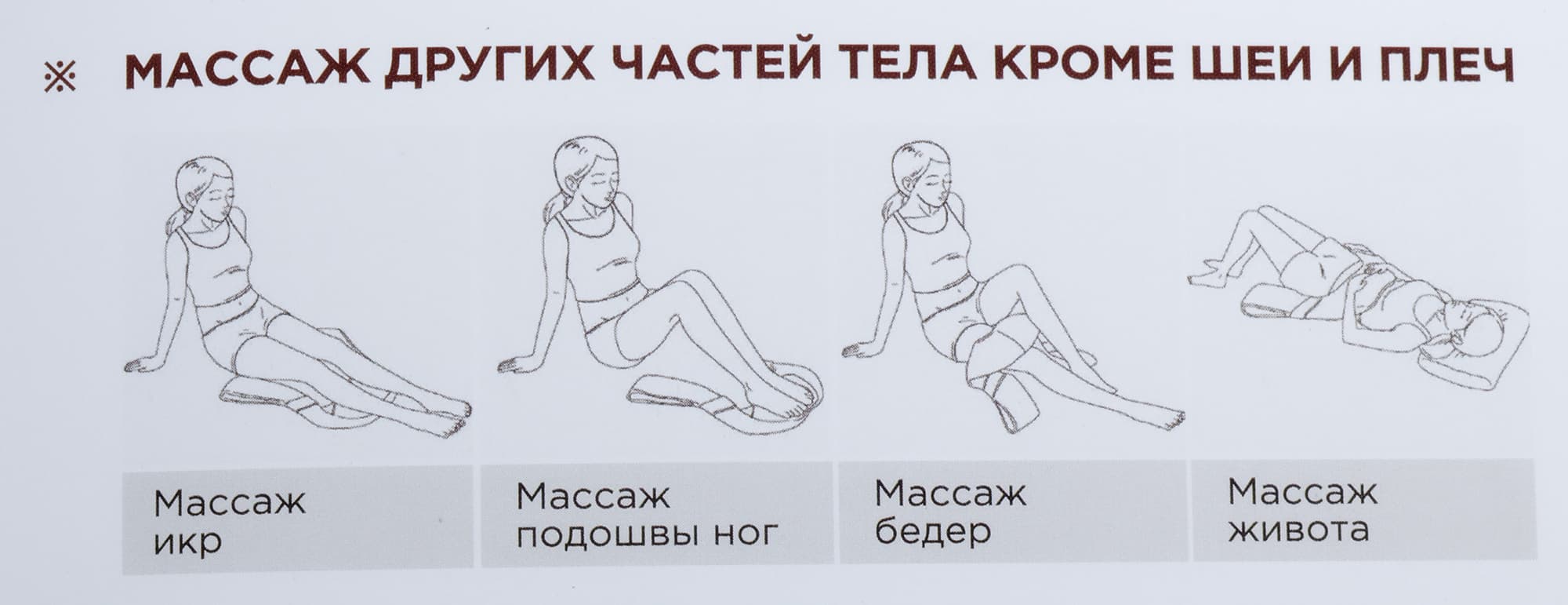 Одна из боковых сторон зарезервирована под подробный рассказ о назначении массажера: им можно массировать шею, плечи, спину, поясницу, кисти рук и предплечья, бедра, икры и живот.