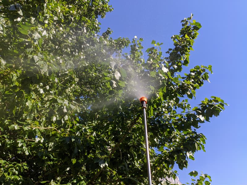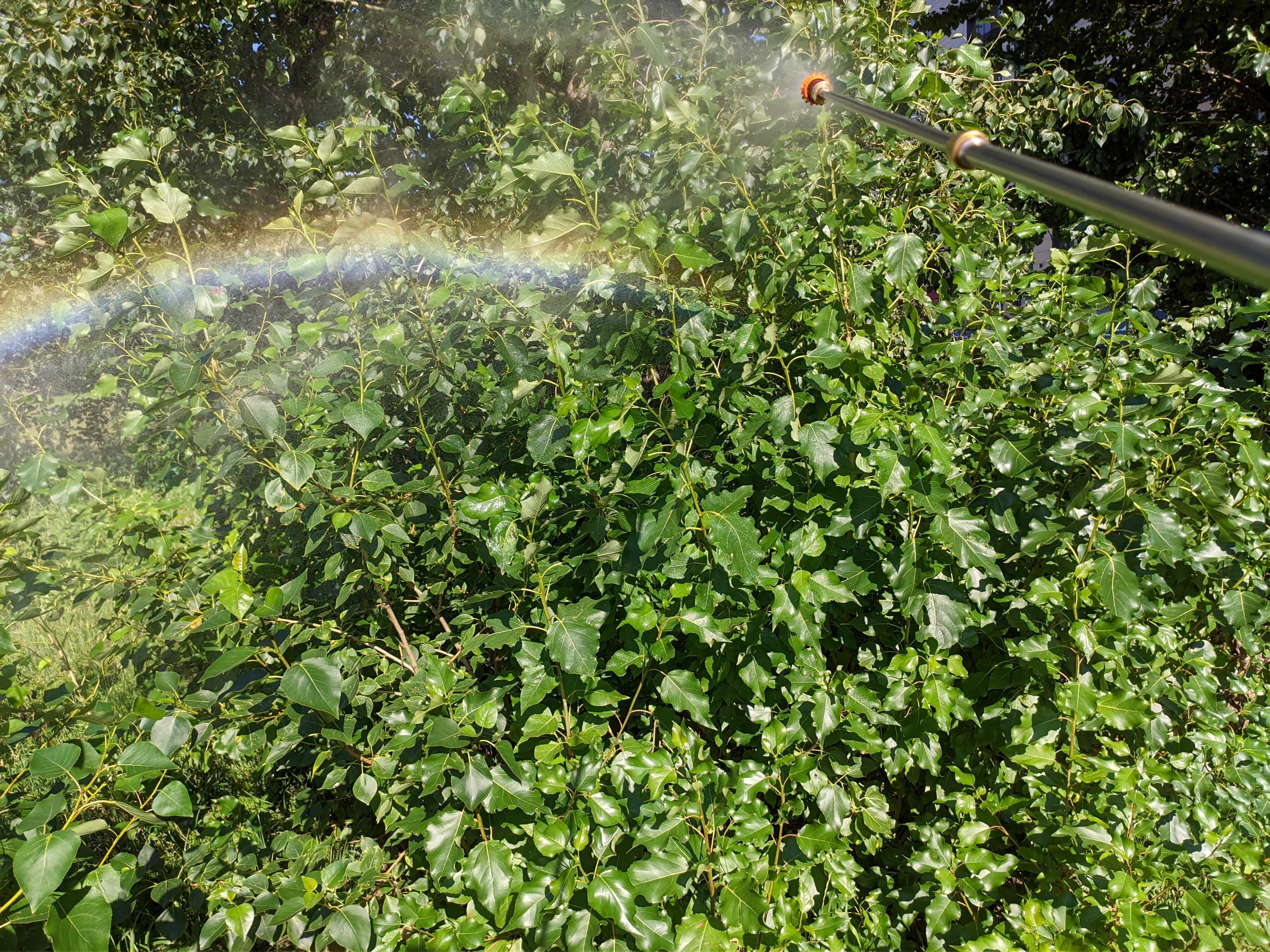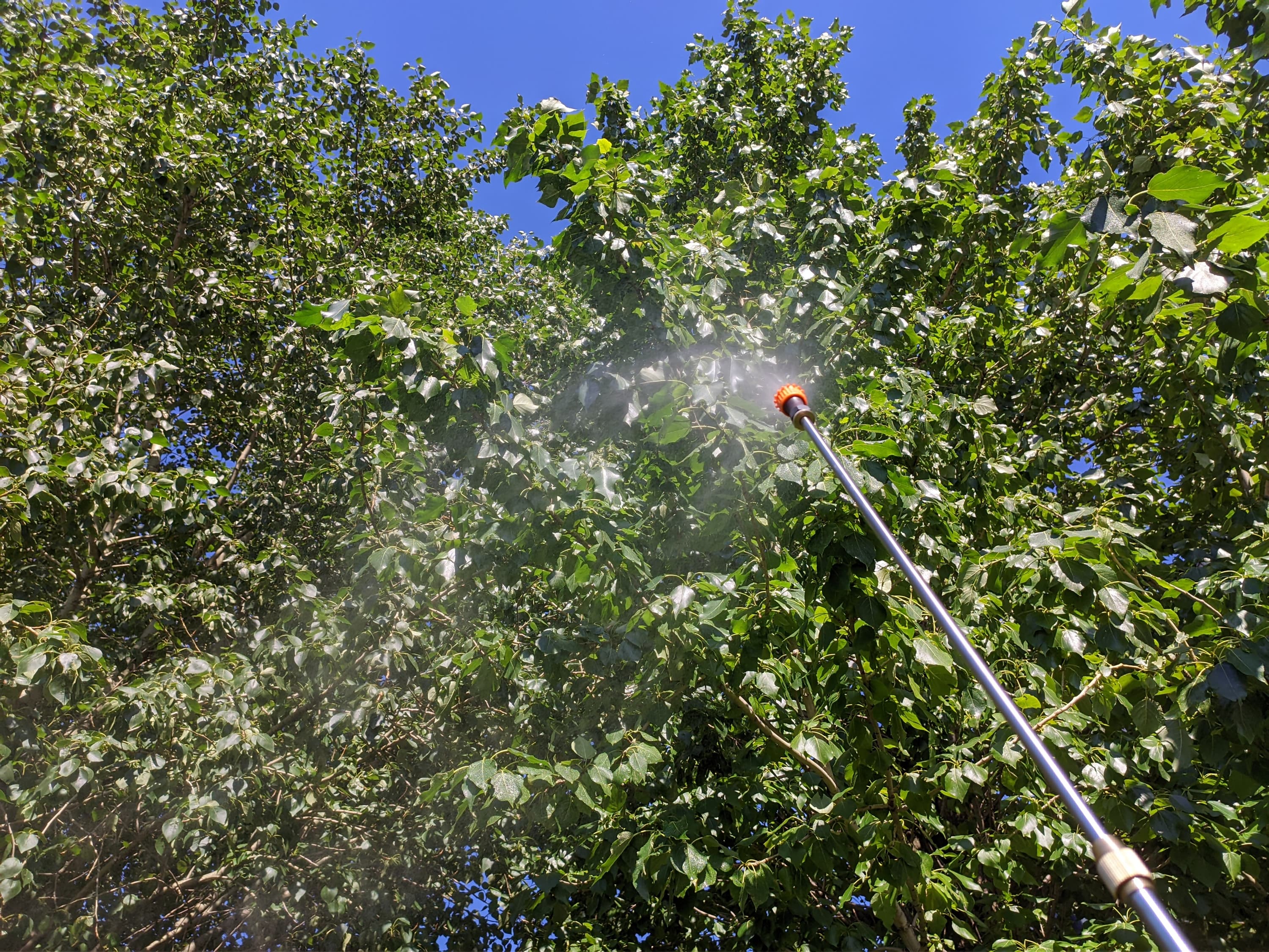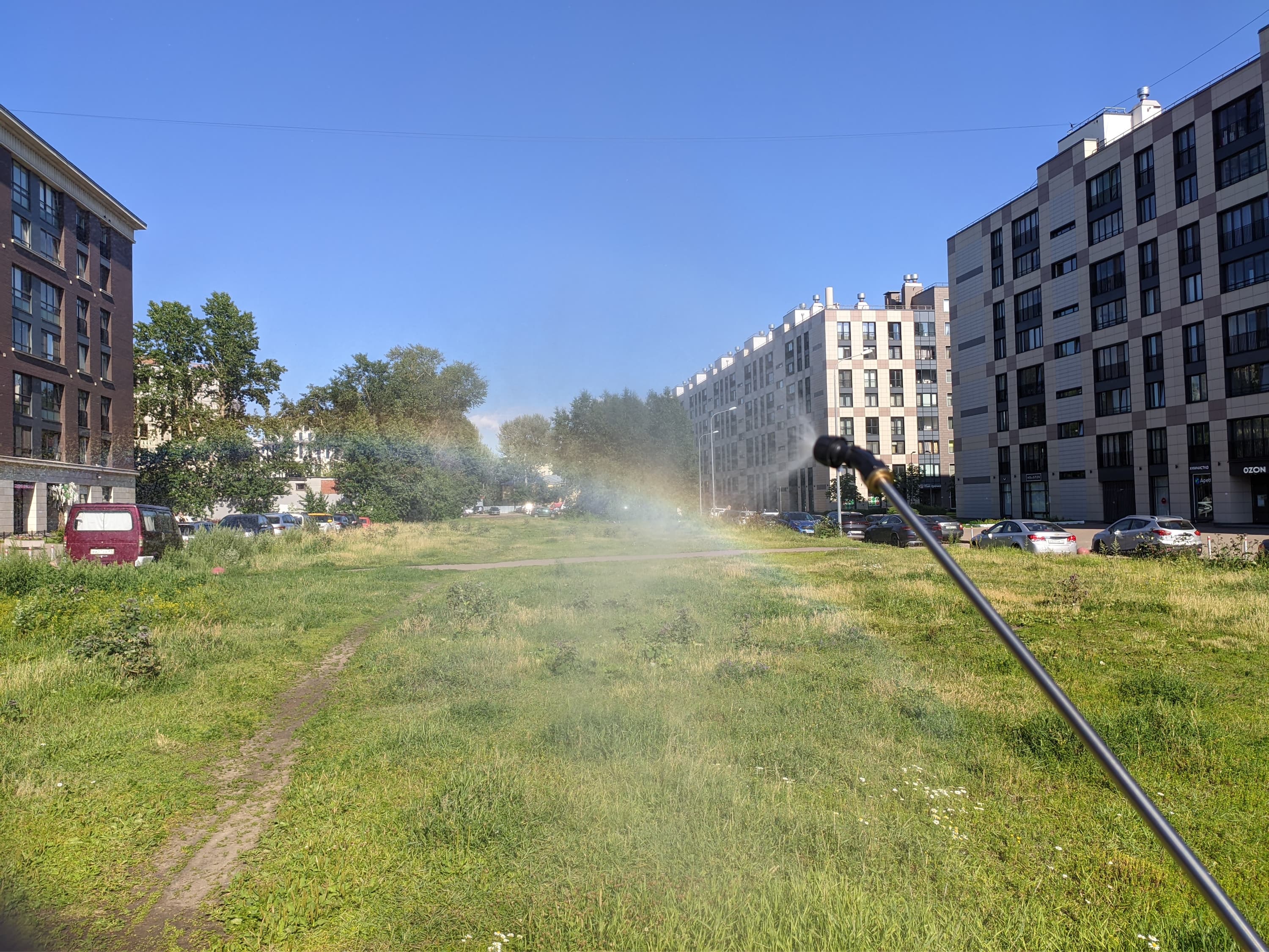 А вот если поднять трубку вертикально вверх, то «фонтан» получится совсем невысокий — до полуметра. То есть мы сможем обрабатывать деревья на высоте до 3-3,5 м (2 м — рост человека с поднятой рукой, 1 м — длина трубки, 0,5 м — высота опрыскивания).