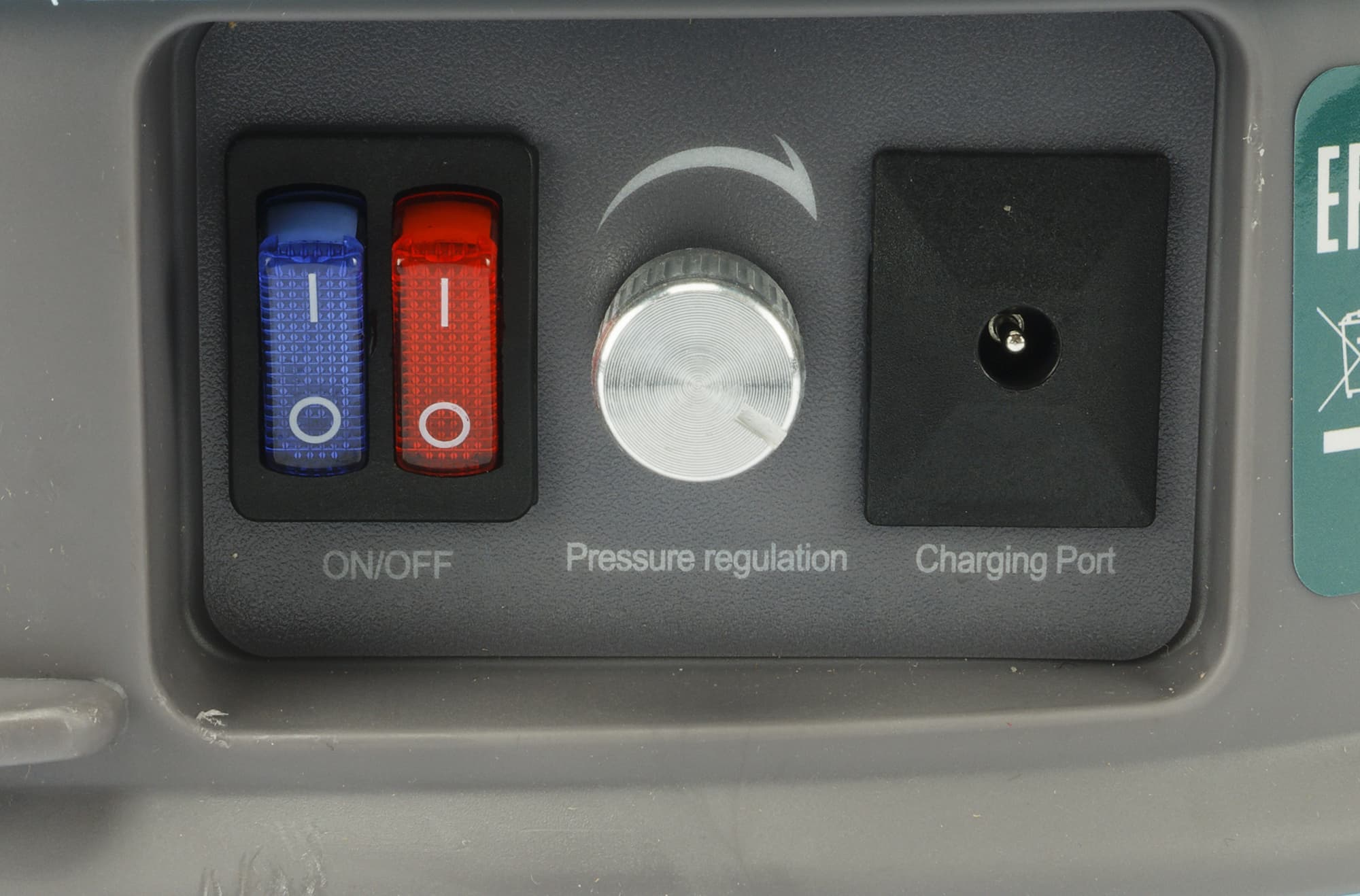 С поворотом ручки мощность помпы возрастает до уровня «чуть ниже максимального» (который, в свою очередь, включается переключателем). Таким образом, ручка регулировки давления по совместительству заменяет кнопку включения. А кнопки включения имеют более высокий приоритет, чем ручка, поскольку даже одна включенная помпа устанавливает бо́льшую мощность, чем ручка, повернутая до максимума. И наоборот: если ручка регулировки повернута, то опрыскиватель продолжит работать, даже если перевести клавиши в положение «выкл.». Сложновато, не правда ли?