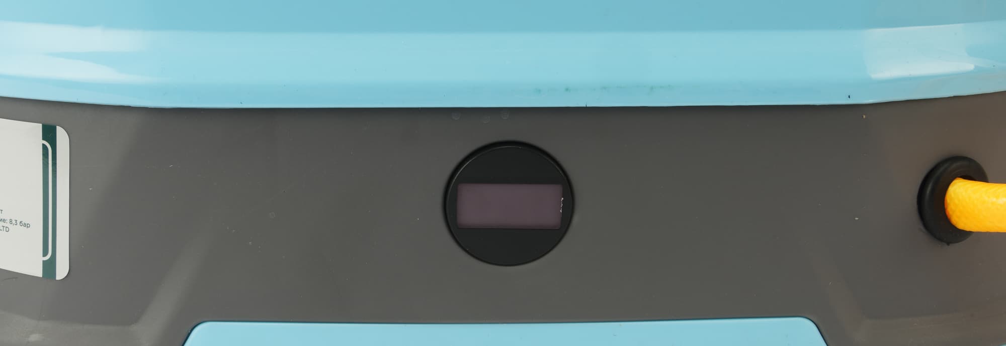 На нижней части лицевой стороны по центру расположен индикатор заряда аккумулятора. Справа — место крепления шланга (он у нашей модели несъемный).