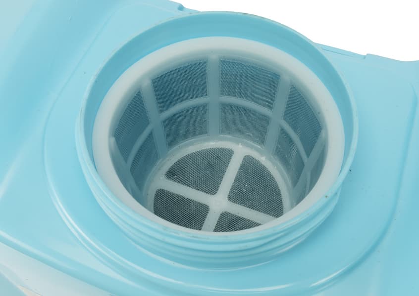 Вода подается в помпу через небольшой съемный фильтр (белый пластиковый колпачок сверху). Снизу находится трубка, которая, судя по всему, служит для выпуска излишков воздуха из камеры помпы. На ее конце мы видим небольшой жиклер, не позволяющий воздуху выходить слишком активно.