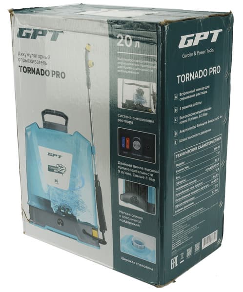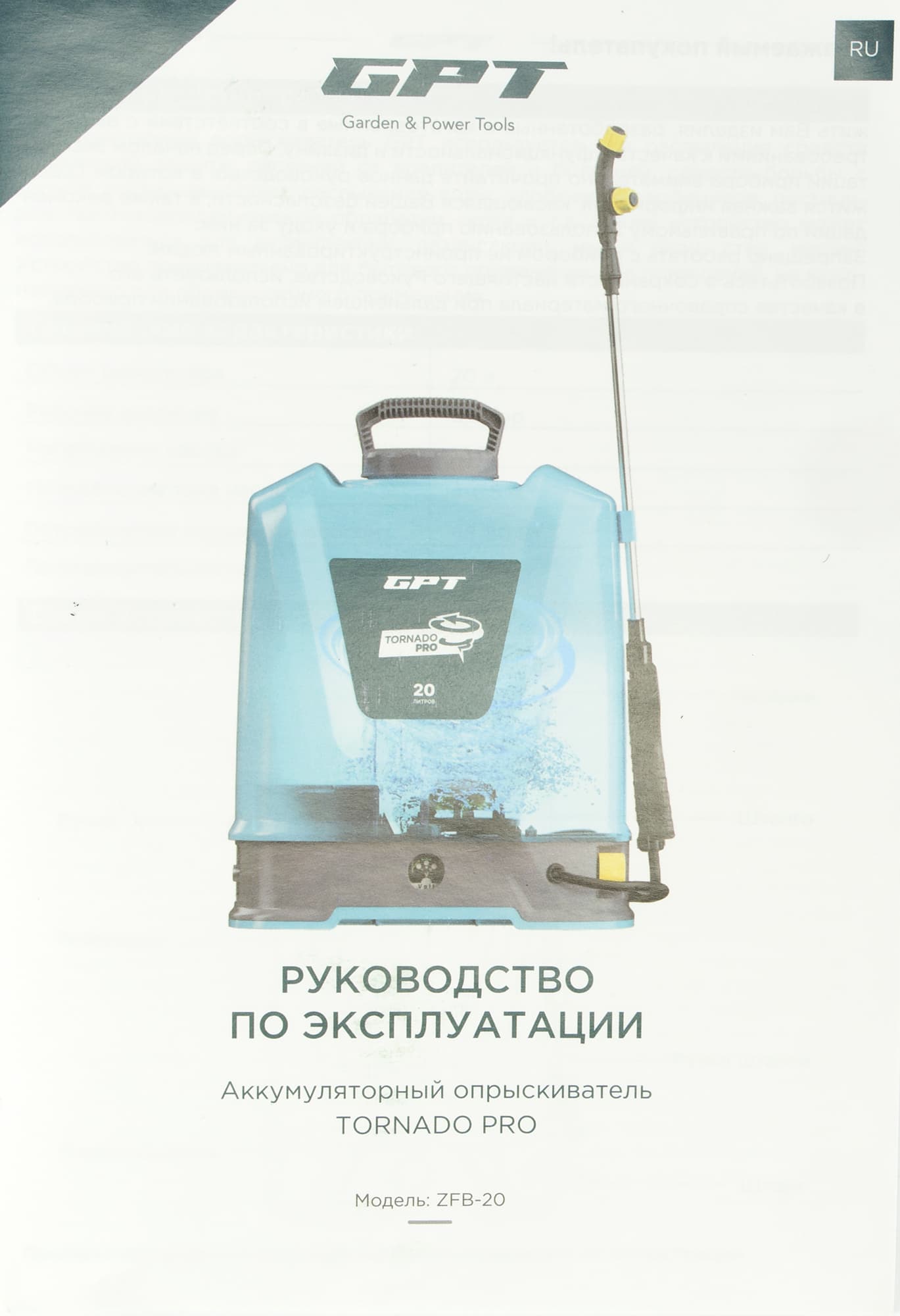 Наш сегодняшний герой — довольно мощный и объемный аккумуляторный садовый опрыскиватель Garden&Power Tools под названием Tornado Pro. Модель получила индекс ZFB-20, что намекает на объем бака 20 литров.