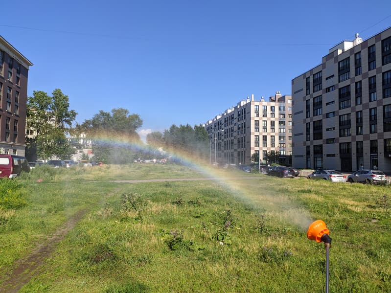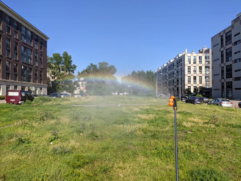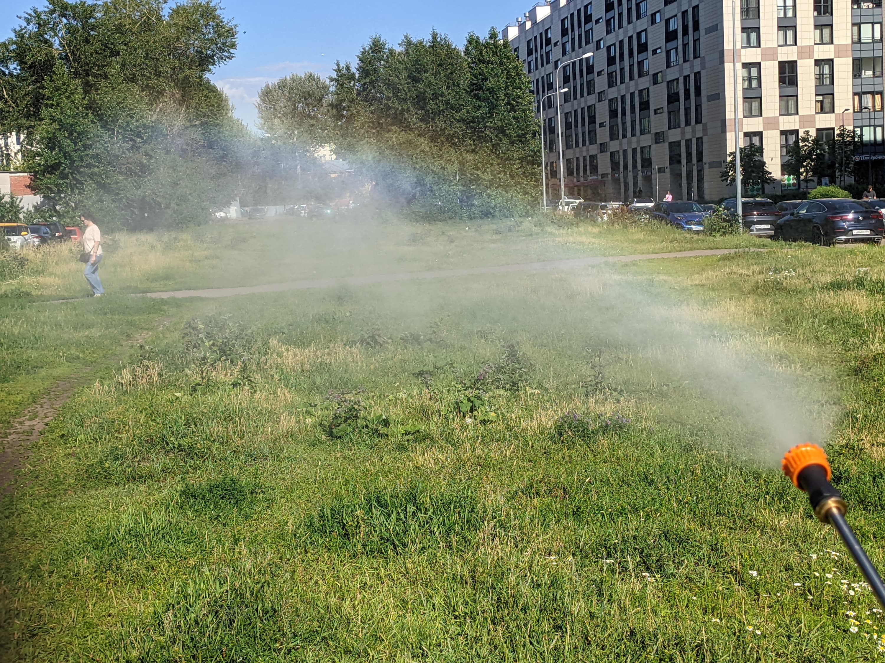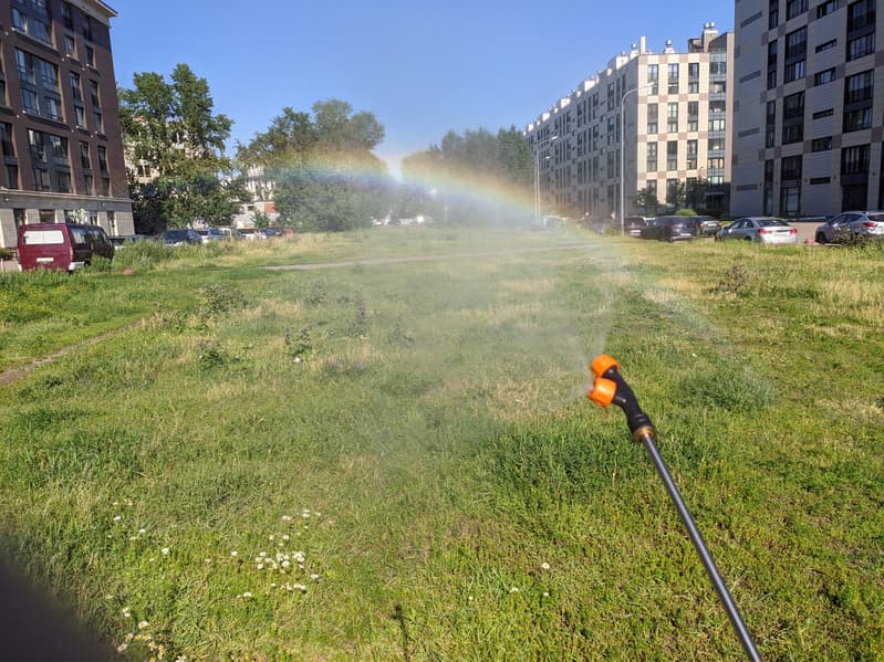 Для того чтобы оценить возможности прибора, мы вышли на ближайший газон и испытали все имеющиеся насадки, визуально оценив степень разбрызгивания и силу подачи воды. К счастью, погода оказалась солнечной, поэтому всё получилось очень наглядно: количество водяных брызг легко оценить благодаря появлению радуги.