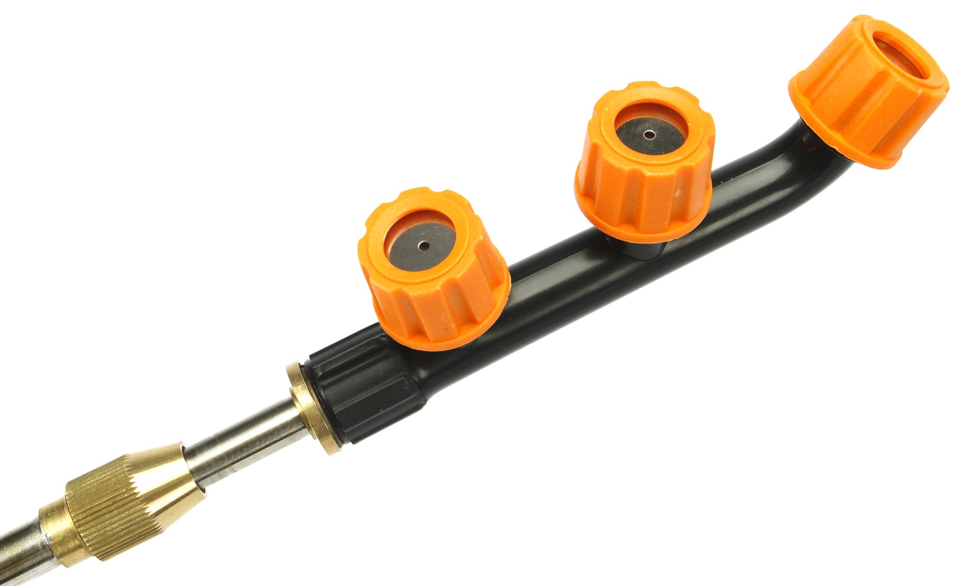 Что может быть лучше двух распылителей? Конечно же, три! Объем подаваемой воды или раствора увеличивается примерно на треть, а вот обрабатываемая площадь, на наш взгляд, увеличилась несущественно. То есть обработка будет происходить примерно по той же площади, но более интенсивно.