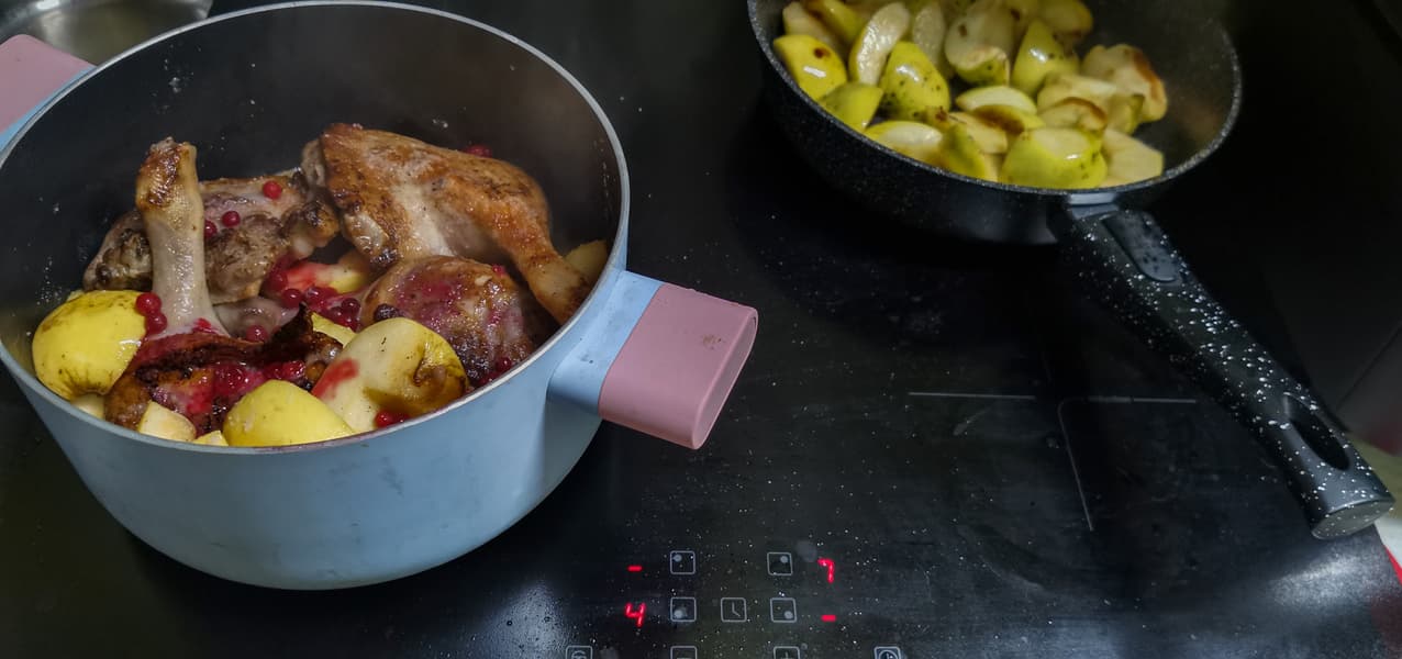 Выложили окорочка и яблоки в кастрюлю, добавили специи и бруснику, накрыли второй порцией карамелизованной антоновки. Оставили кастрюлю на средней мощности на полчаса, затем убавили мощность до 2 и держали на плите еще минут 45.