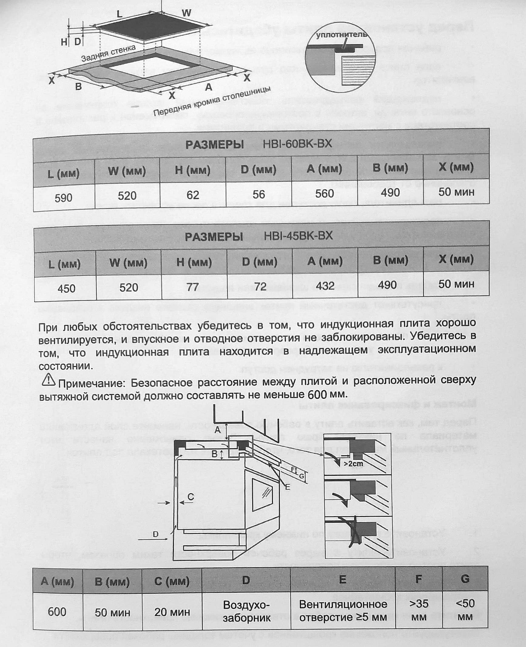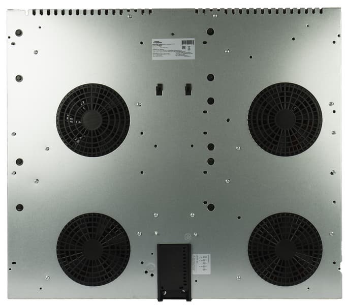 Снизу 4 встроенных вентилятора на каждую конфорку. Вентиляция включается сразу при включении конфорки и продолжает работать еще некоторое время после выключения плиты. Для нормального функционирования прибора нужно обеспечить достаточное пространство под поверхностью и перед ней.