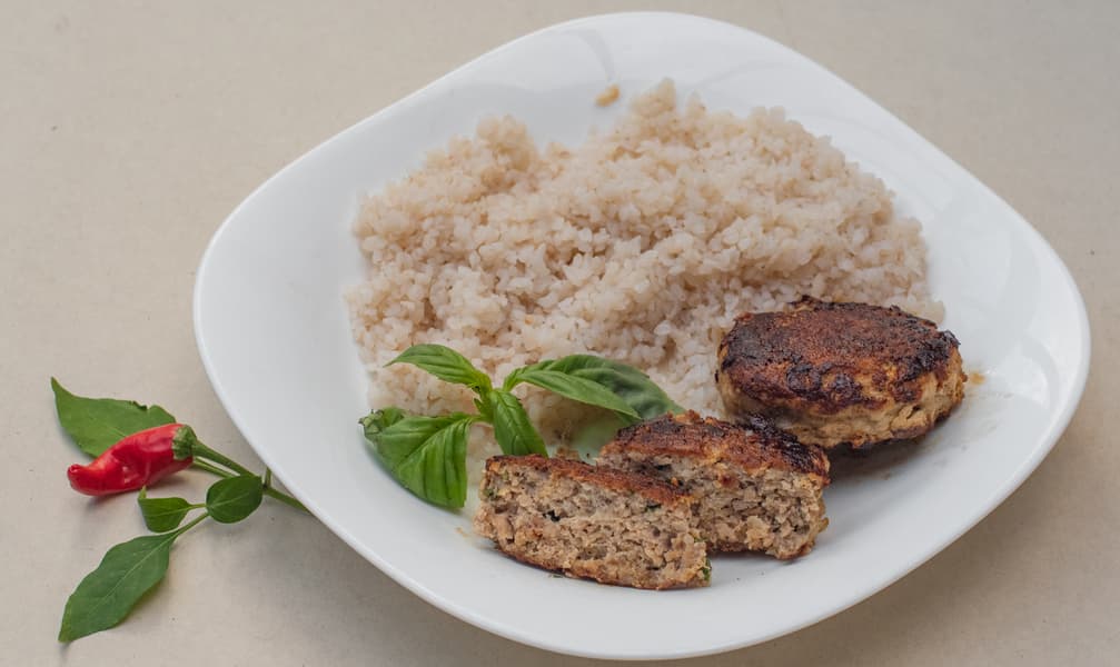 Обжаривали на режиме 8, доводили до готовности на режиме 5. Котлеты получились отлично, мощности плиты хватило с избытком. Подали с белой гречей.