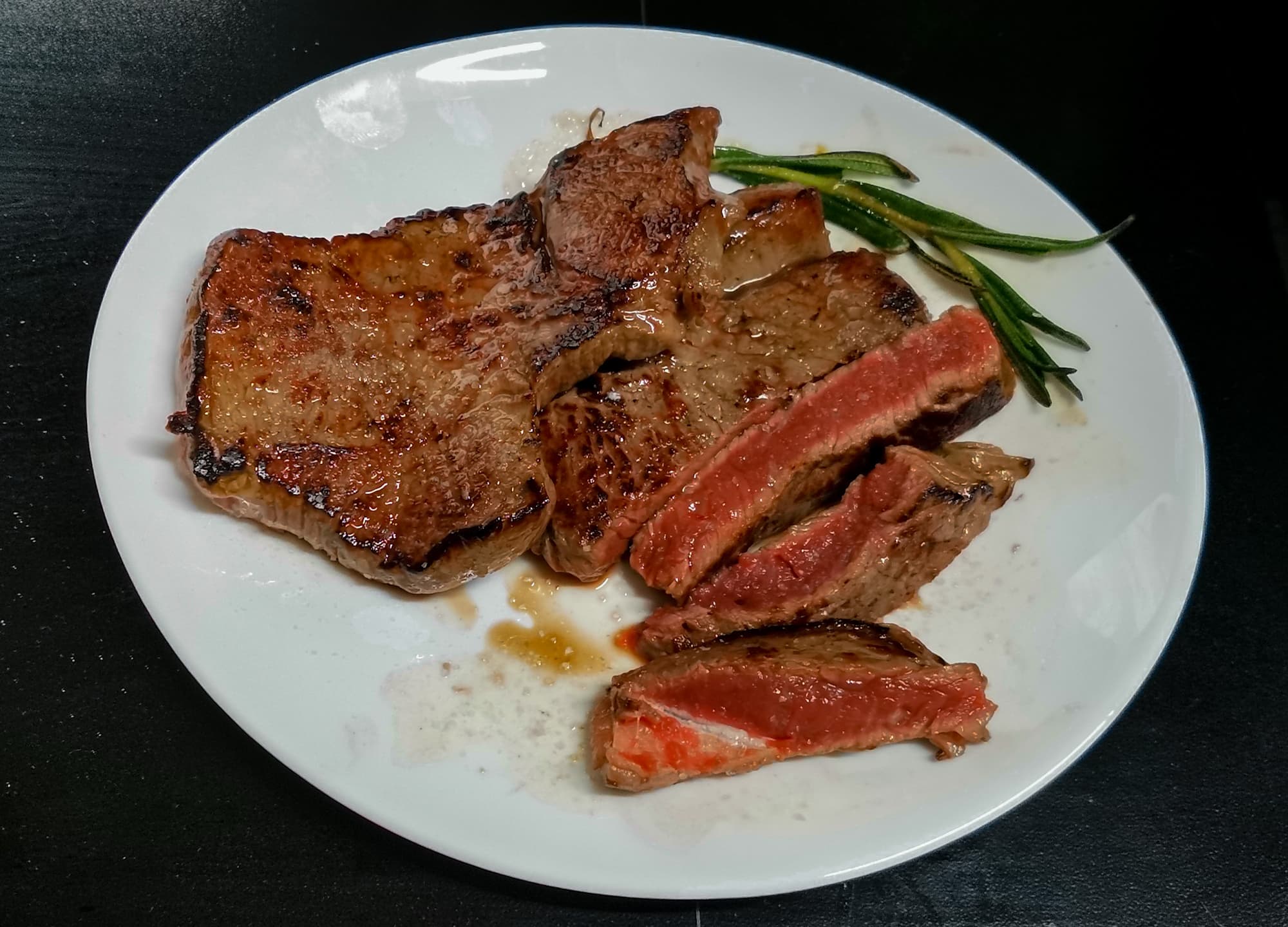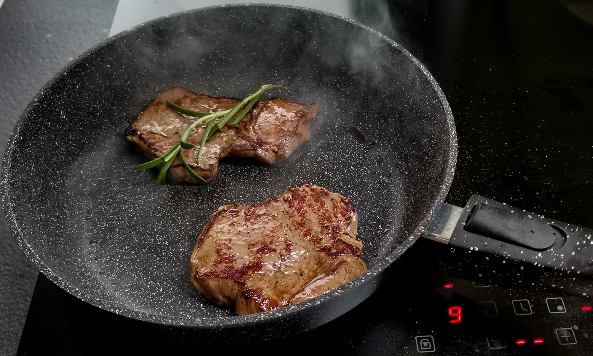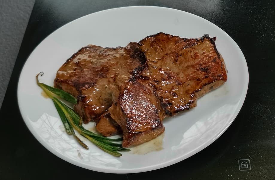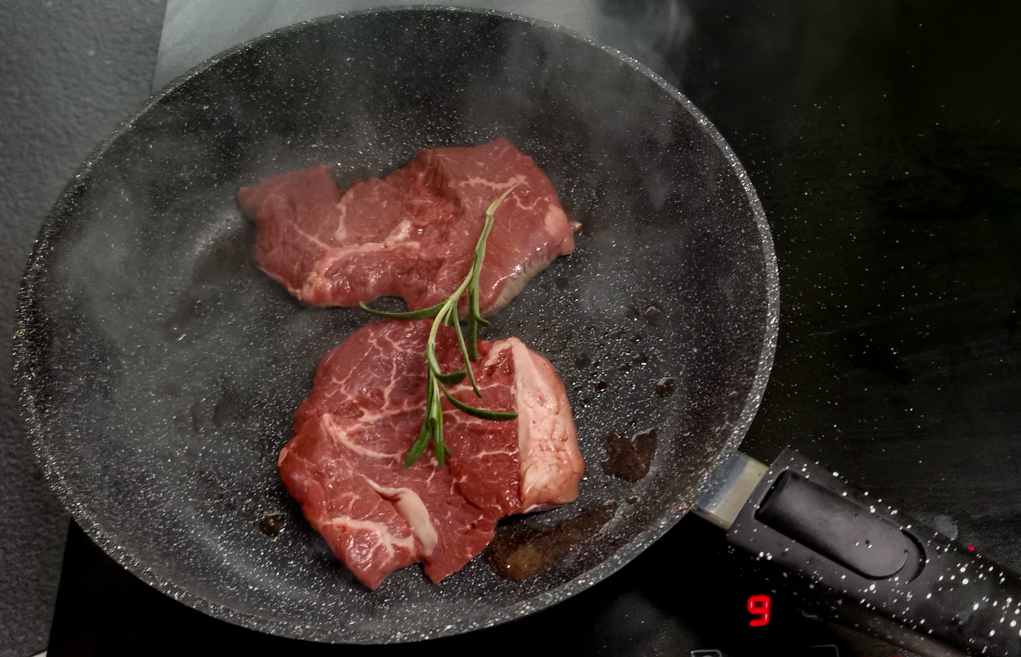 Из-за высокой температуры мясо запечаталось сразу, никакого сока не выделилось, сковородка осталась сухой.