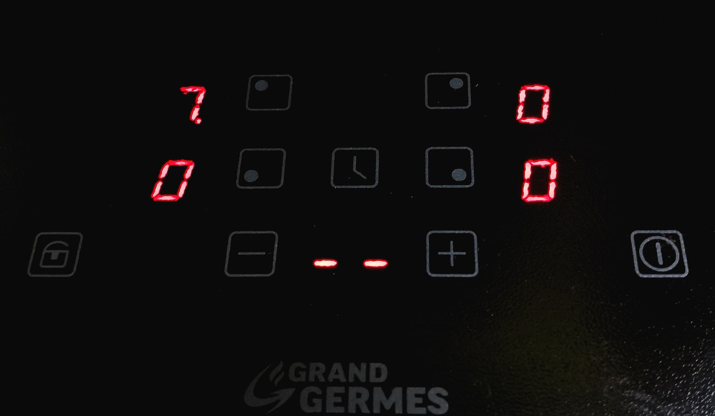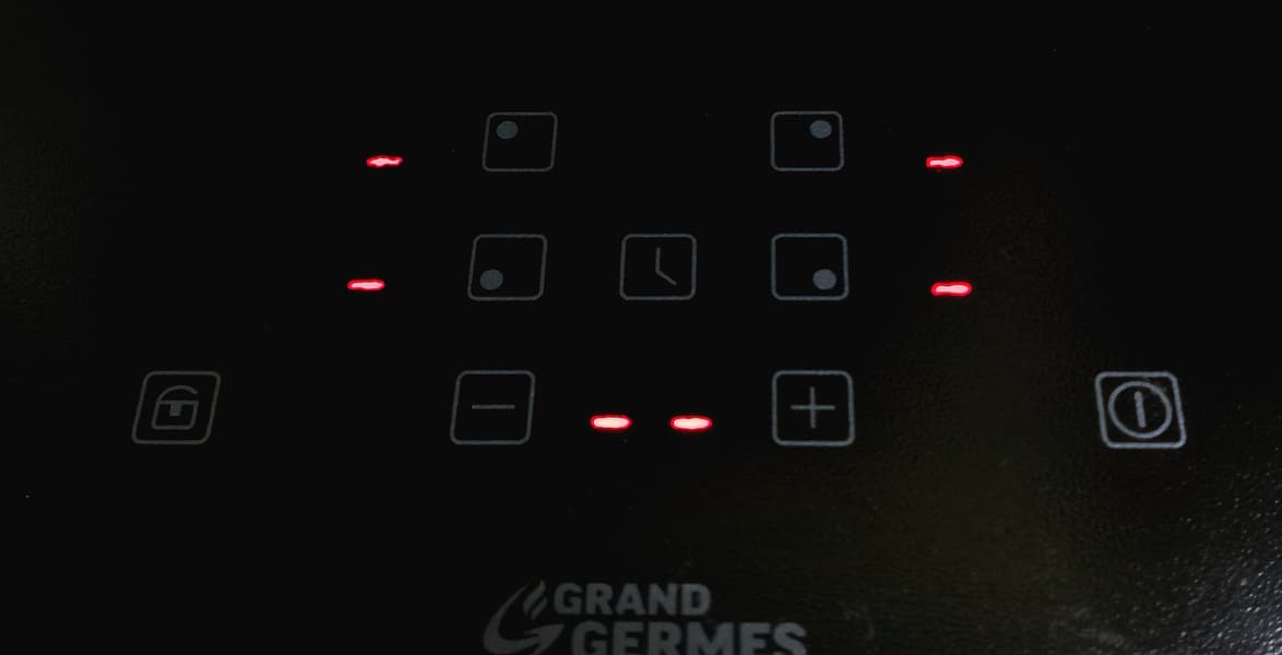 Панель управления находится на передней стороне поверхности по центру и состоит из 9 сенсорных кнопок и 5 индикаторов. По бокам находятся кнопки включения/выключения и блокировки. Центральная кнопка — таймер. Верхние 4 кнопки с небольшими точками — кнопки соответствующих варочных зон плиты, под ними установочные «+» и «−».