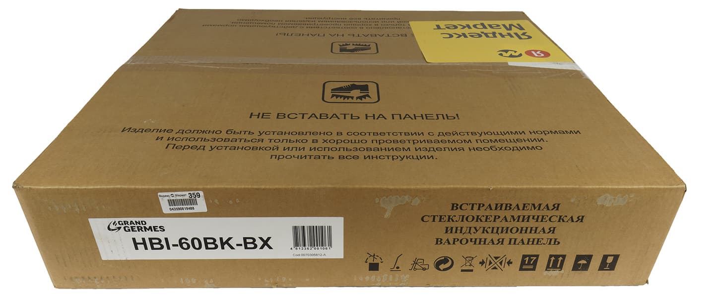 Плита прибыла на тесты в картонной коробке, надежно закрепленная внутри вставками. На коробке черная полиграфия — название модели и основные характеристики. По бокам технические символы и пиктограммы. Ручками коробка не оборудована.