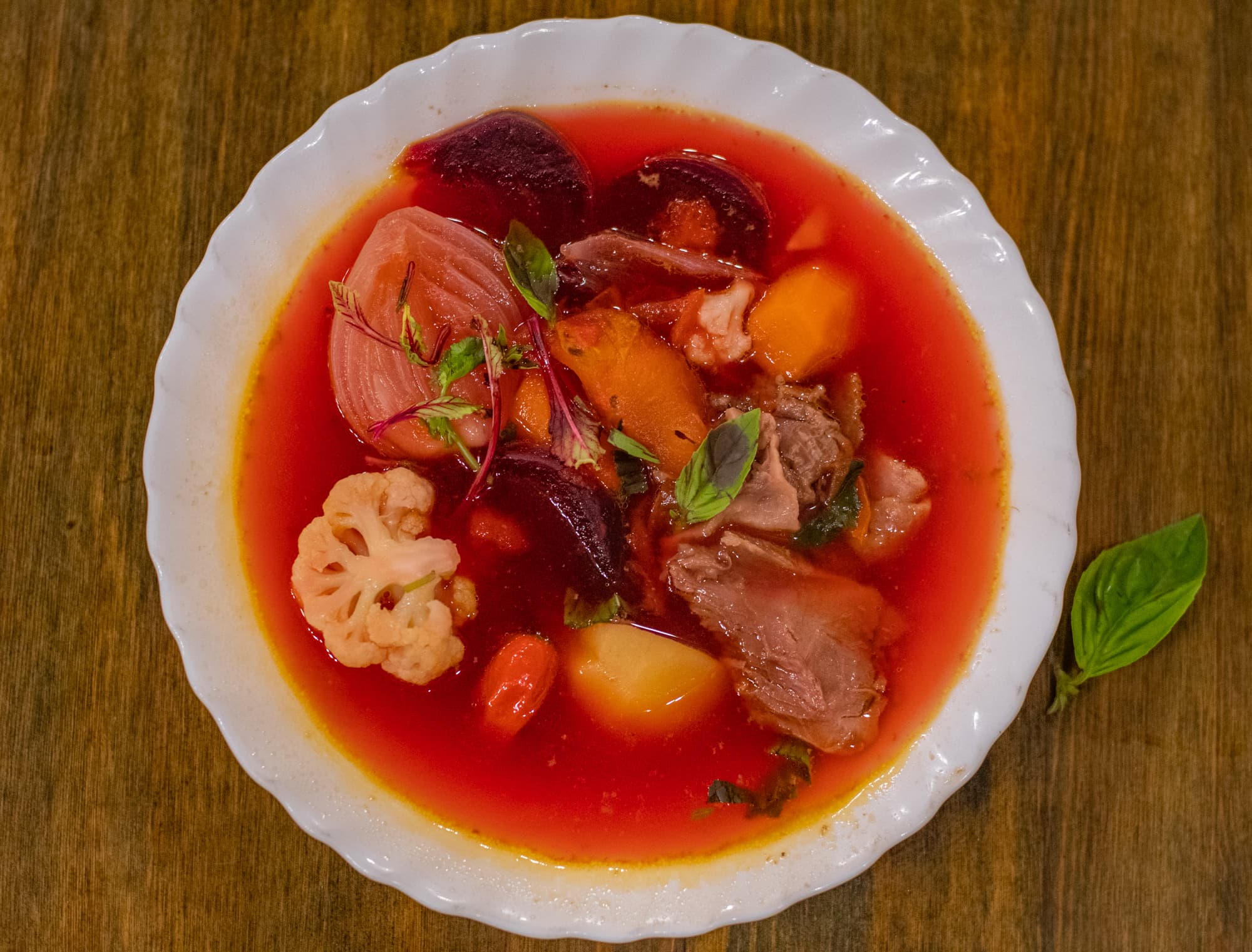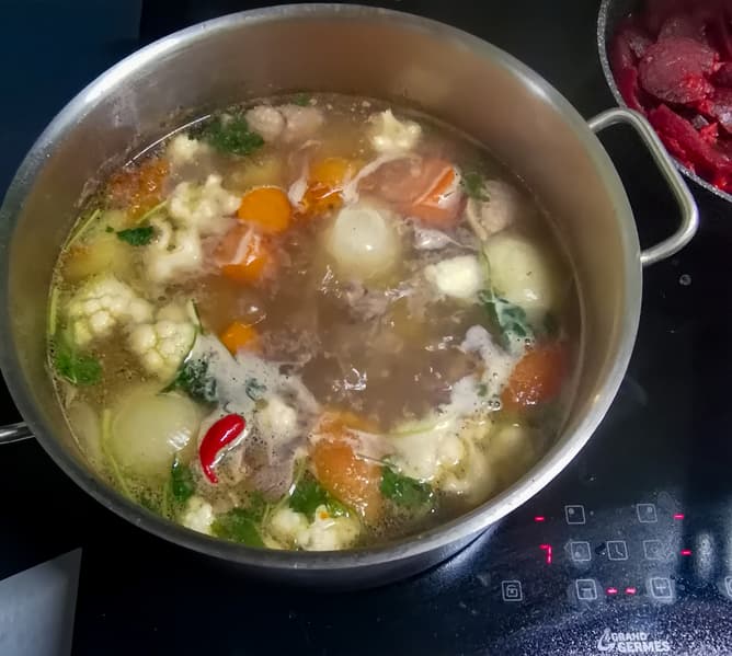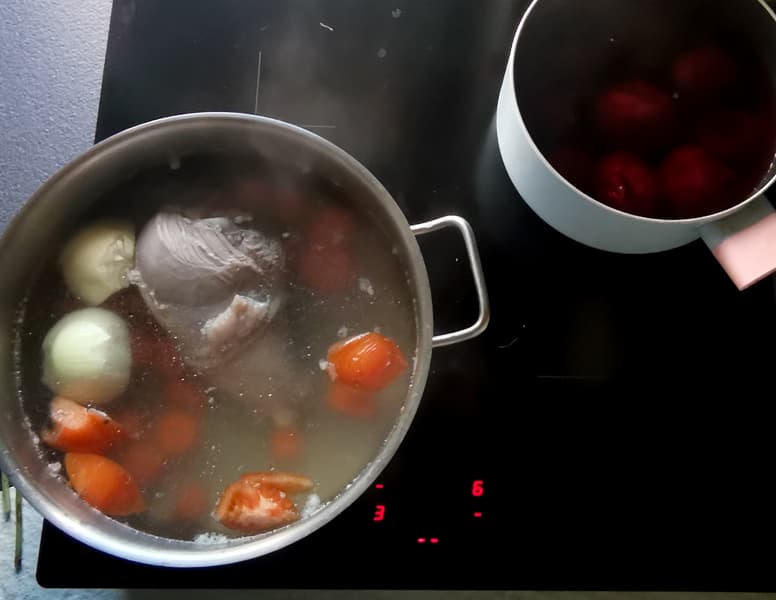 Борща не может быть много, поэтому мы готовили его в кастрюле на 9 литров. Для основы использовали бульон из индейки с овощами, который готовился в течение 2,5 часов на малой мощности. Свеклу варили отдельно.