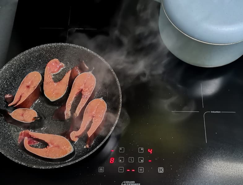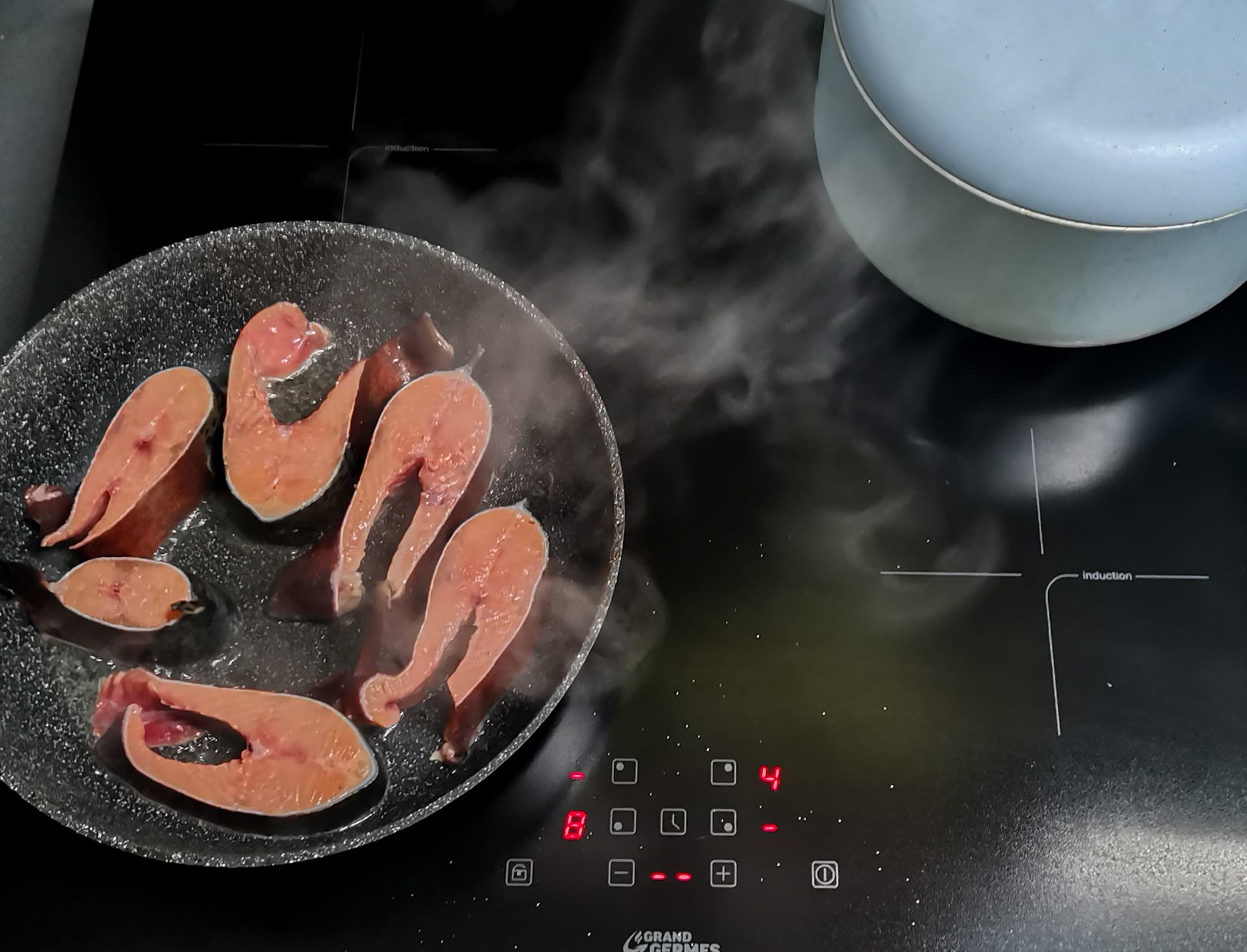 Как известно, в приготовлении рыбы очень важную роль играет правильный выбор температуры. Мы решили приготовить на нашей Grand Germes HBI-60BK-BX стейки форели с рисом. Рис варили на средней мощности, а рыбу быстро обжарили с двух сторон на мощности 8 и немного подержали на 6-7.