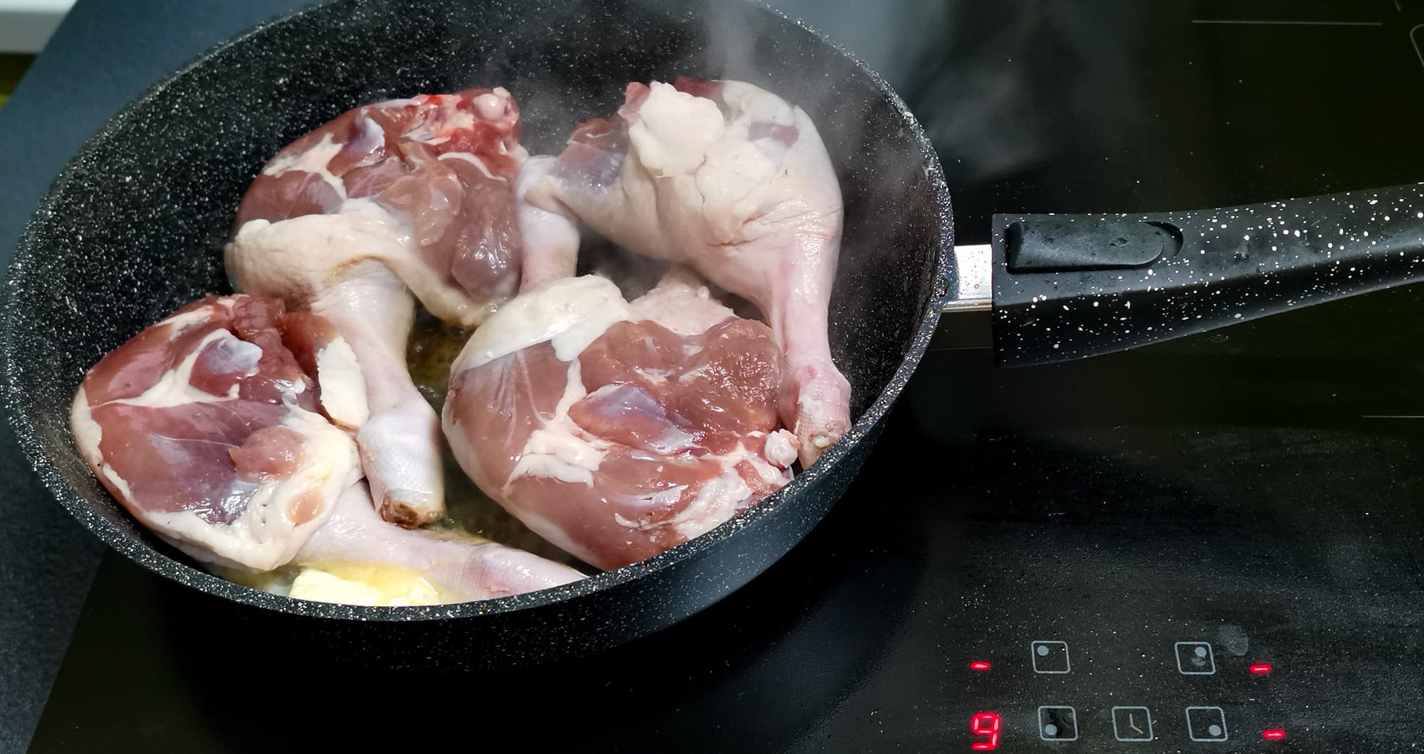 Сначала мы обжарили окорочка в масле на максимальной мощности на сковородке.