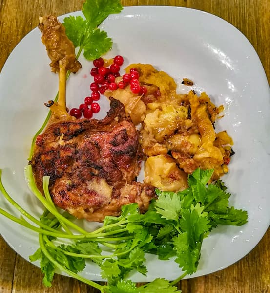 Получившуюся утку сервировали с ягодами и кинзой.