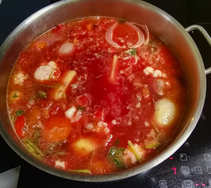 Когда основа была готова, мы спассеровали нарезанную свеклу в томатах и добавили ее к супу.