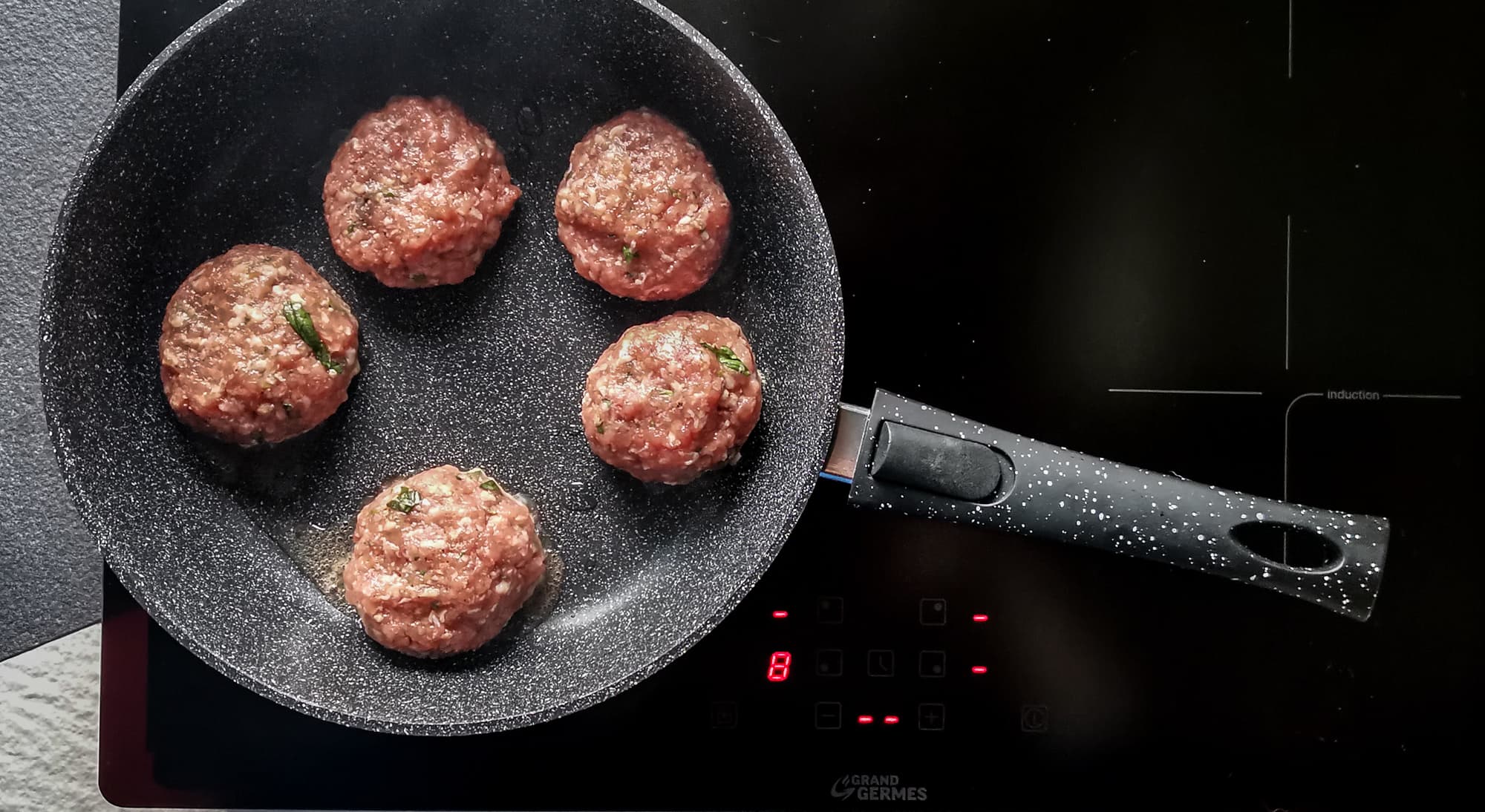 Мы начали тестирование с самого простого — котлет. Взяли обычный домашний фарш, яйца, специи и зелень. Сформировали котлеты, отправили их на заранее прогретую сковородку.