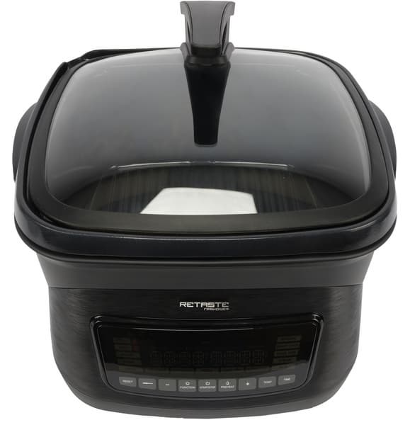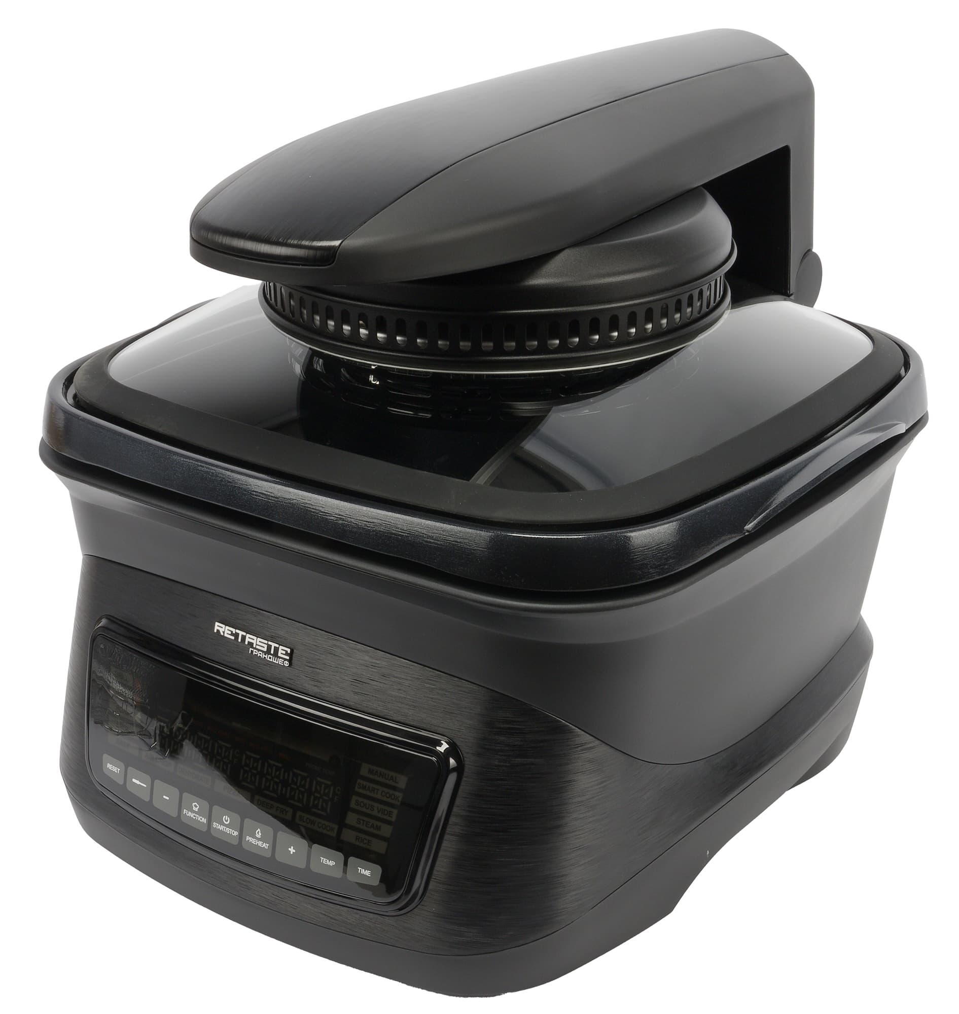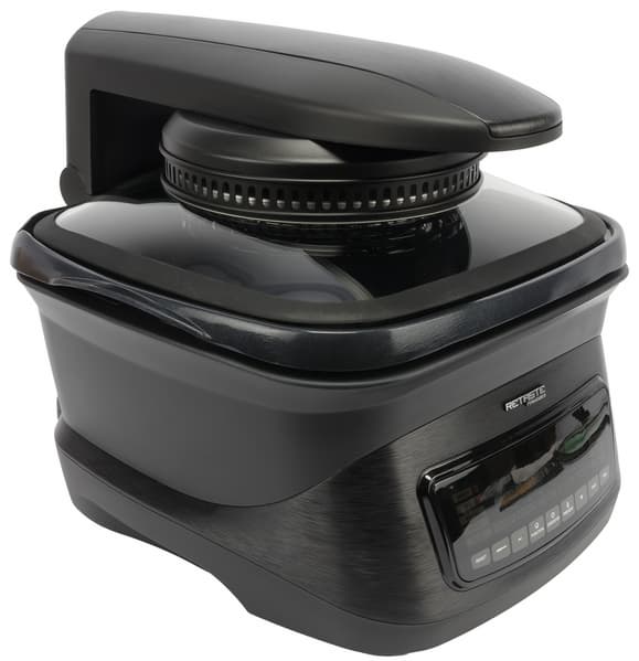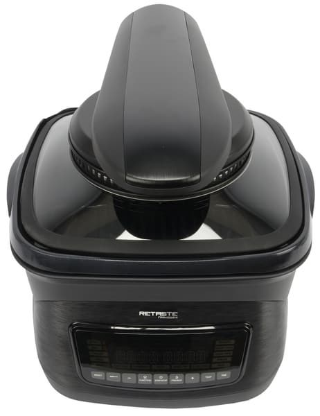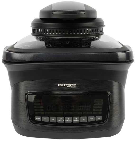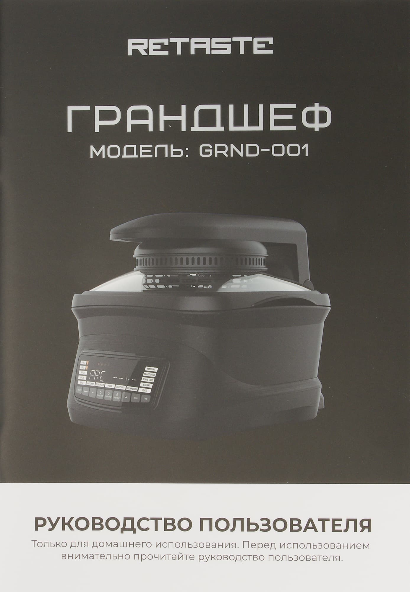 Крупный увесистый аэрогриль ГрандШеф Retaste GRND-001 выглядит солидно и очень привлекательно. Производитель выпускает модель в двух цветах: черном и белом. Нам достался первый вариант.