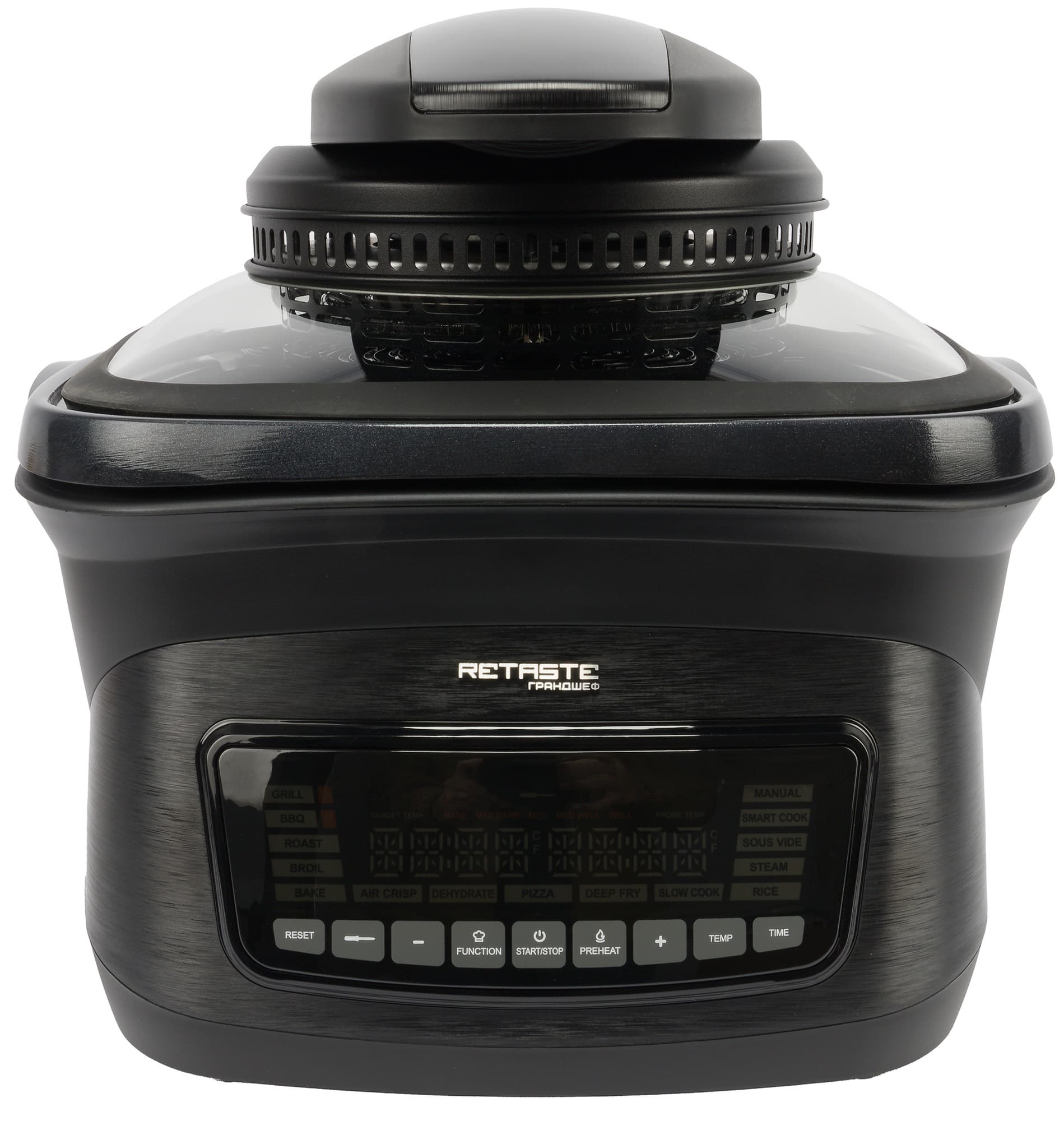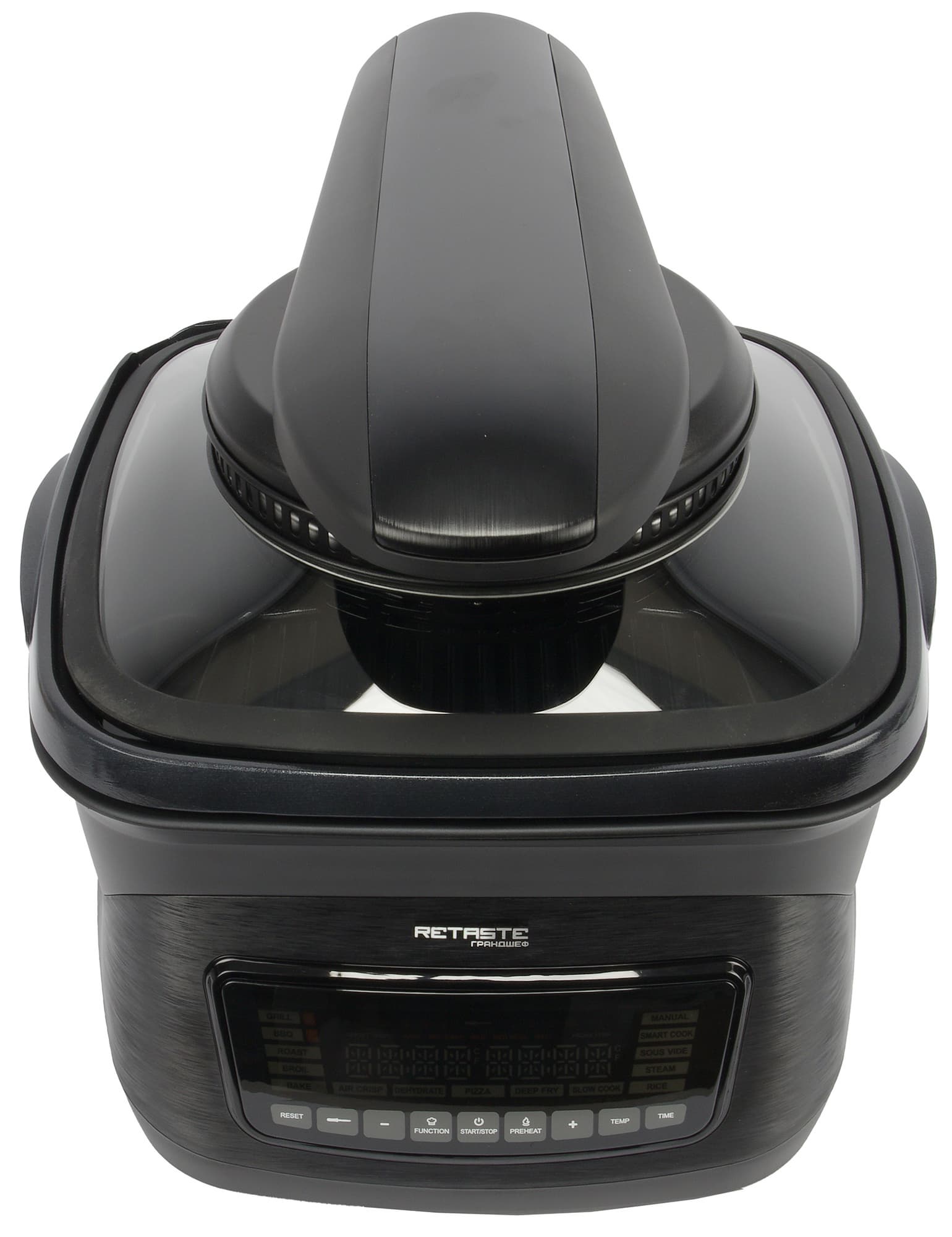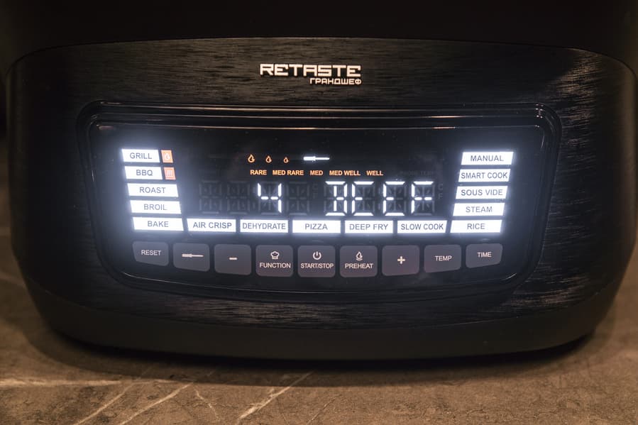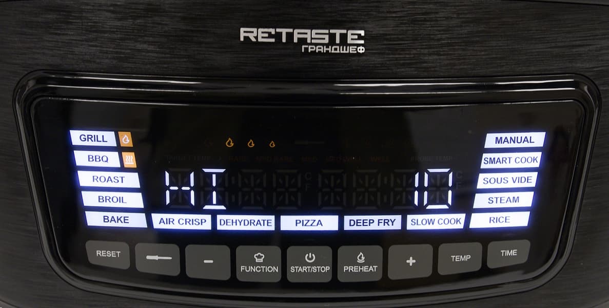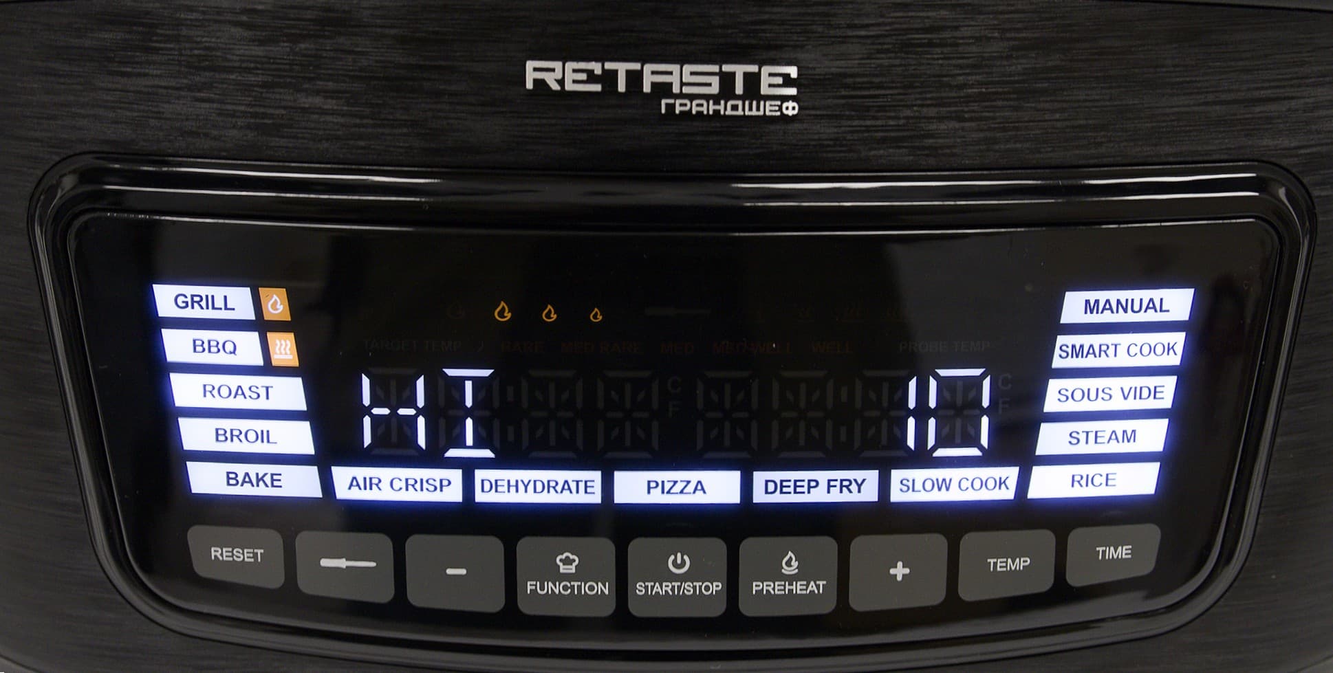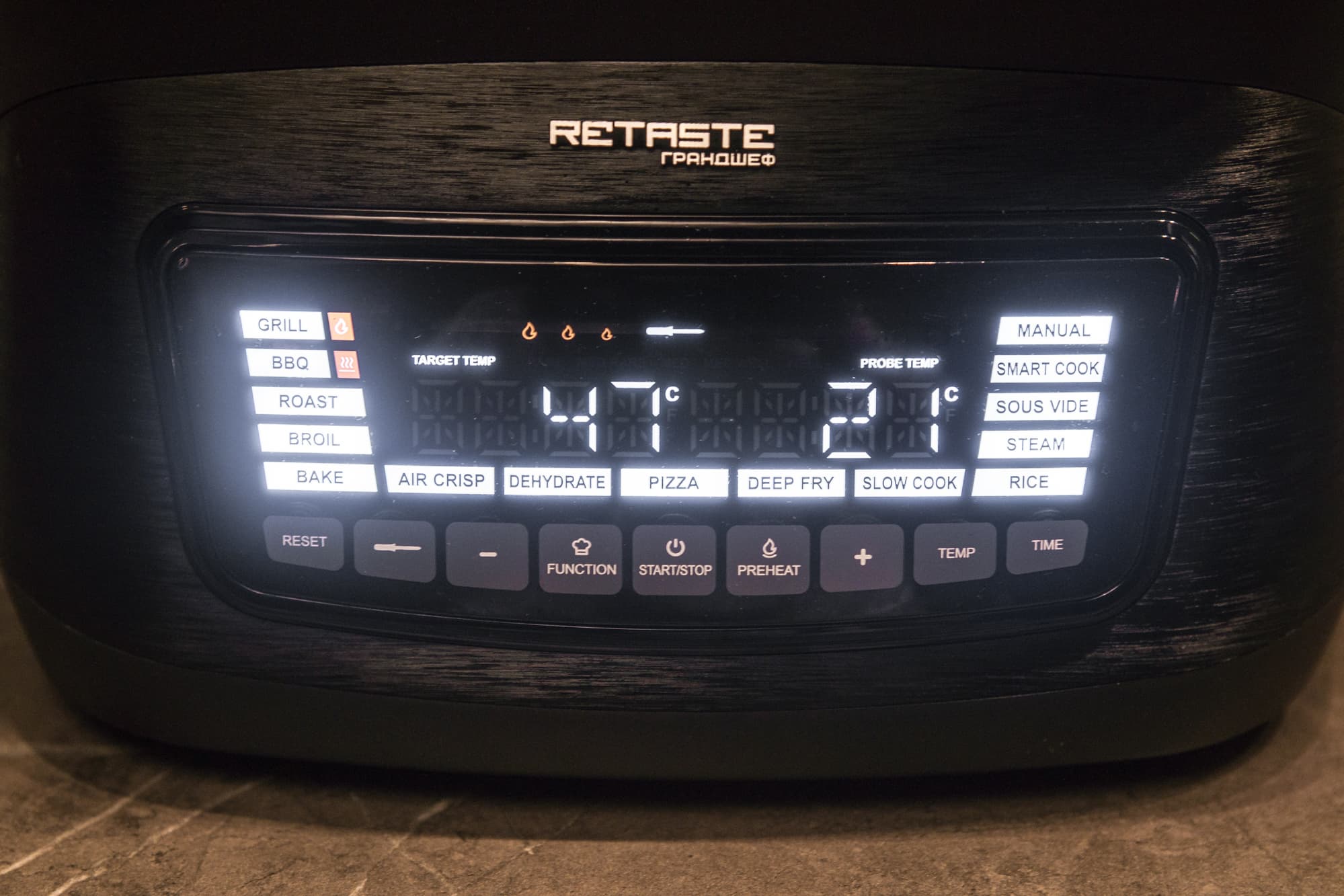 Кроме своих основных обязанностей — запекания и жарки — ГрандШеф Retaste GRND-001 также варит, тушит, размораживает, подогревает, готовит на пару́ и умеет длительно поддерживать низкую температуру для приготовления блюд методом су-вид. Функциональность, как и внешний вид устройства, впечатляют. Так ли хорош аэрогриль в деле, расскажем в нашем сегодняшнем обзоре.