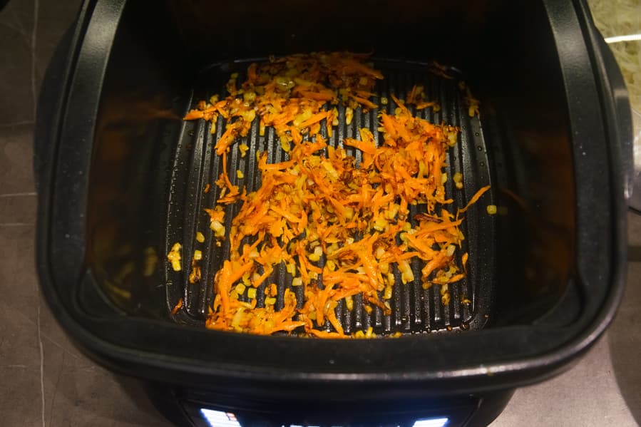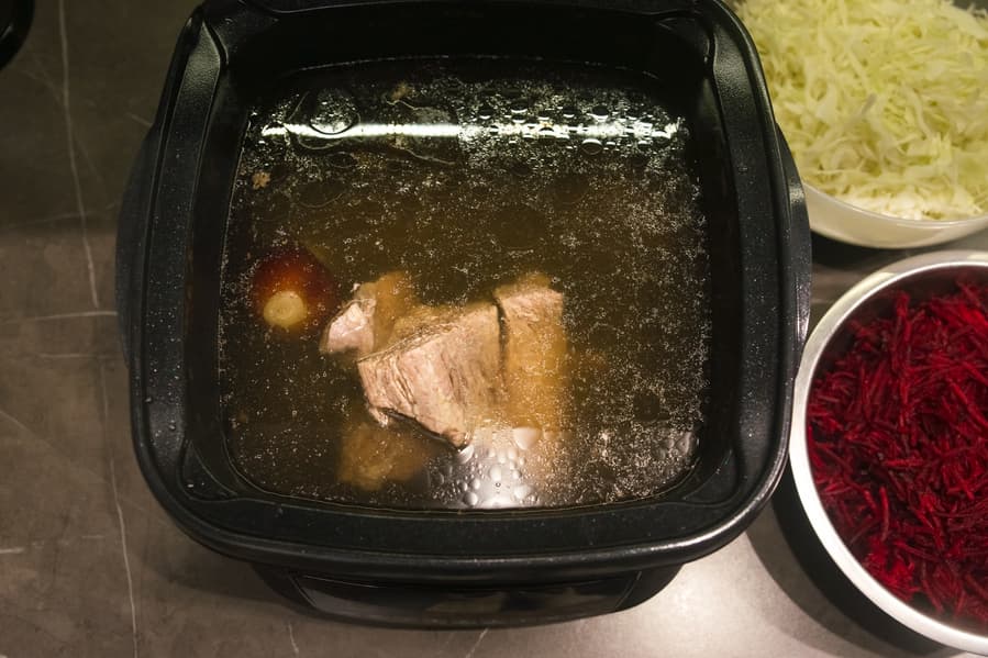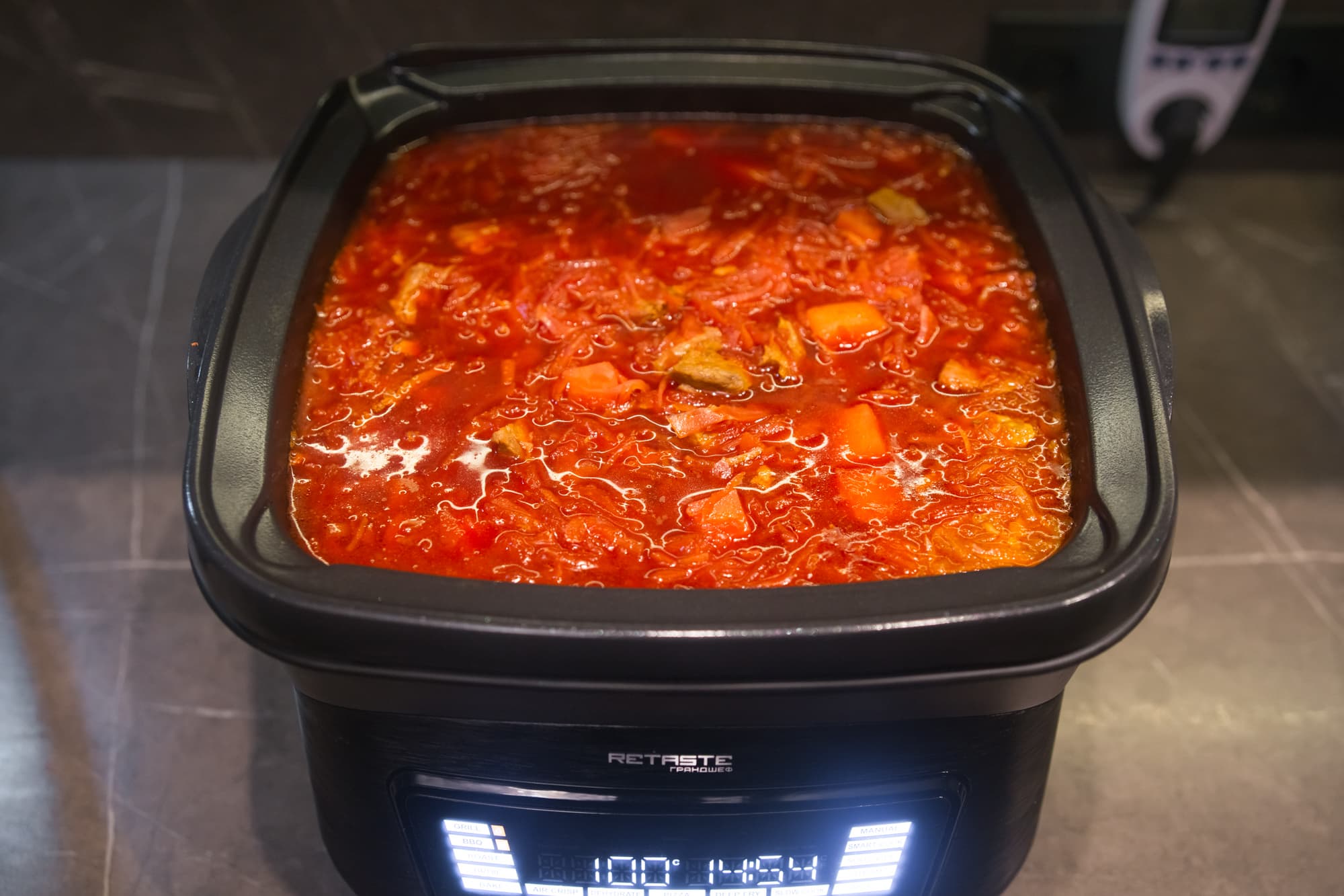 Затем переложили всё в отдельную емкость, а в чашу вернули бульон. Закинули в него картофель и включили нагрев до 120 °C. Минут через 10 добавили нашинкованную капусту, следом за ней — остальные овощи, а еще чуть позже — нарезанное отварное мясо. Убавили температуру до 100 °C, накрыли крышкой и варили до готовности. Примерно через полчаса выключили аэрогриль и оставили борщ в покое еще минут на 30.