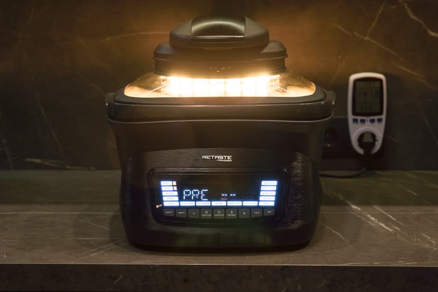 За 30 минут обжаривания продуктов в режиме Manual при максимальной температуре в 240 °C расход электричества составил 0,760 кВт·ч. На запекание целой курицы в течение часа (30 минут в режиме Roast и 30 минут в Air Crisp) было потрачено 1,225 кВт·ч. Энергопотребление за 8,5 часов в режиме Sous Vide при 64 °C составило 0,510 кВт·ч.