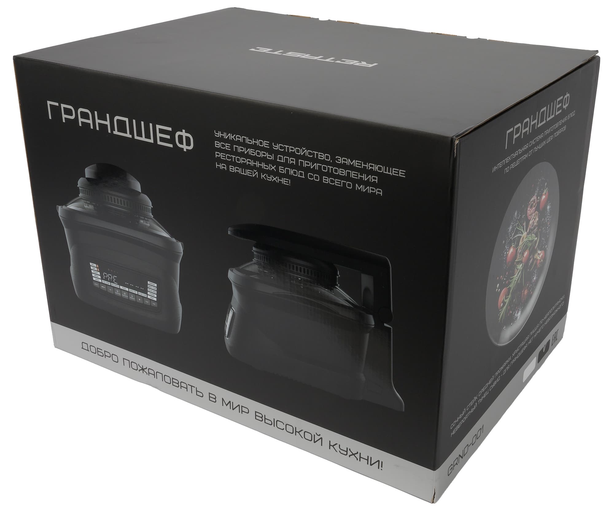 Аэрогриль ГрандШеф Retaste GRND-001 прибыл на тесты в большой коробке из технического картона, внутри которой обнаружилась еще одна, оформленная в фирменном стиле компании. На черном фоне упаковки мы видим крупное изображение прибора, краткое описание его особенностей, а также фотографию блюда, приготовленного с его помощью.