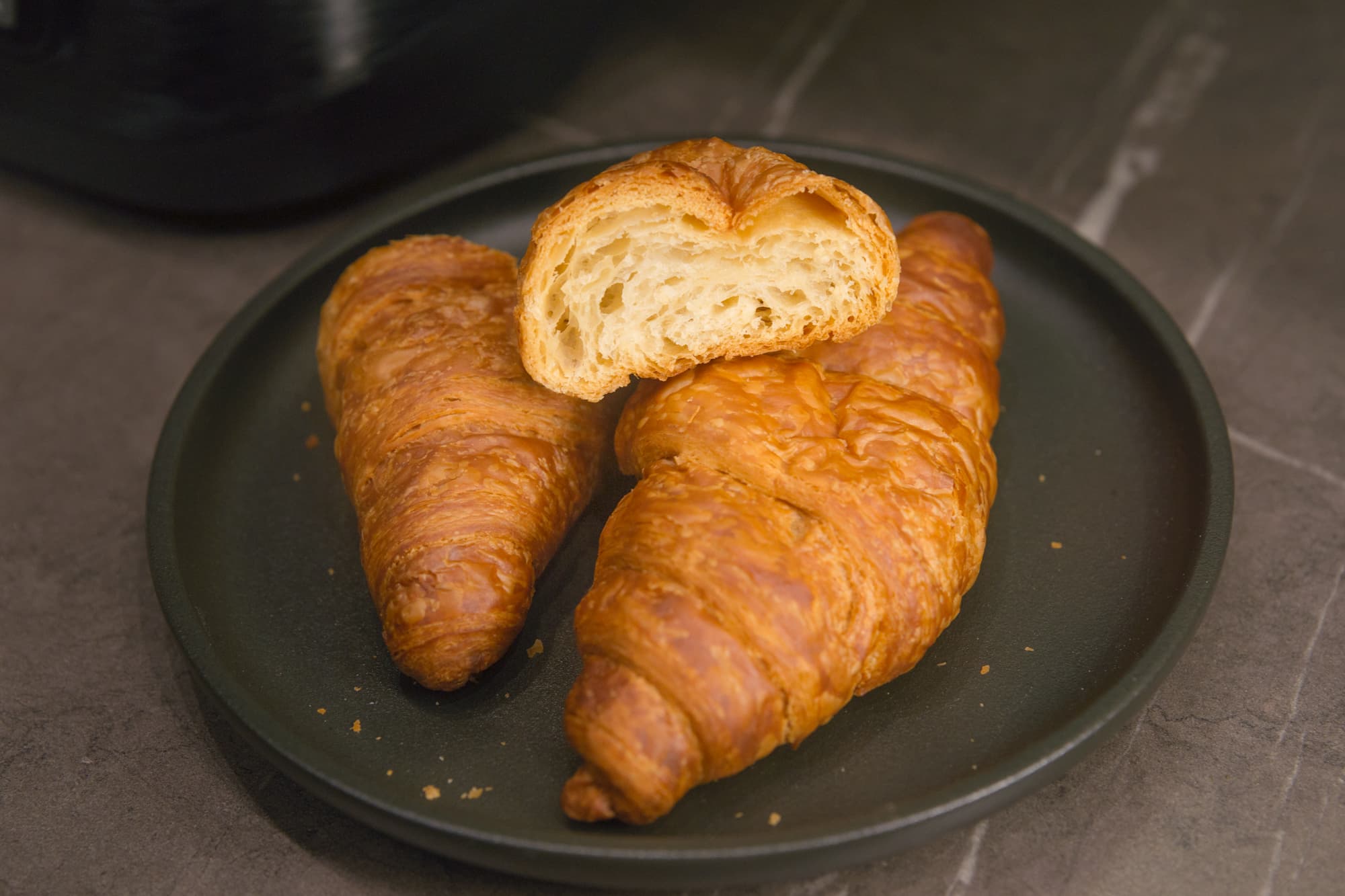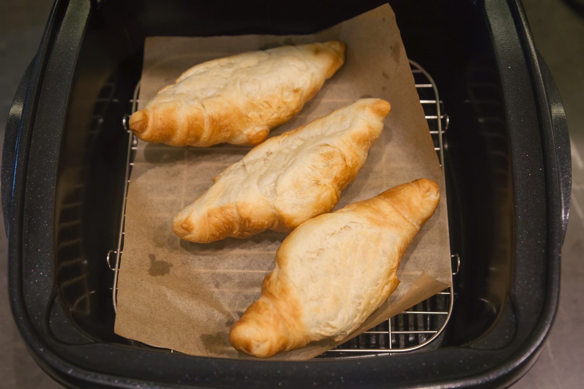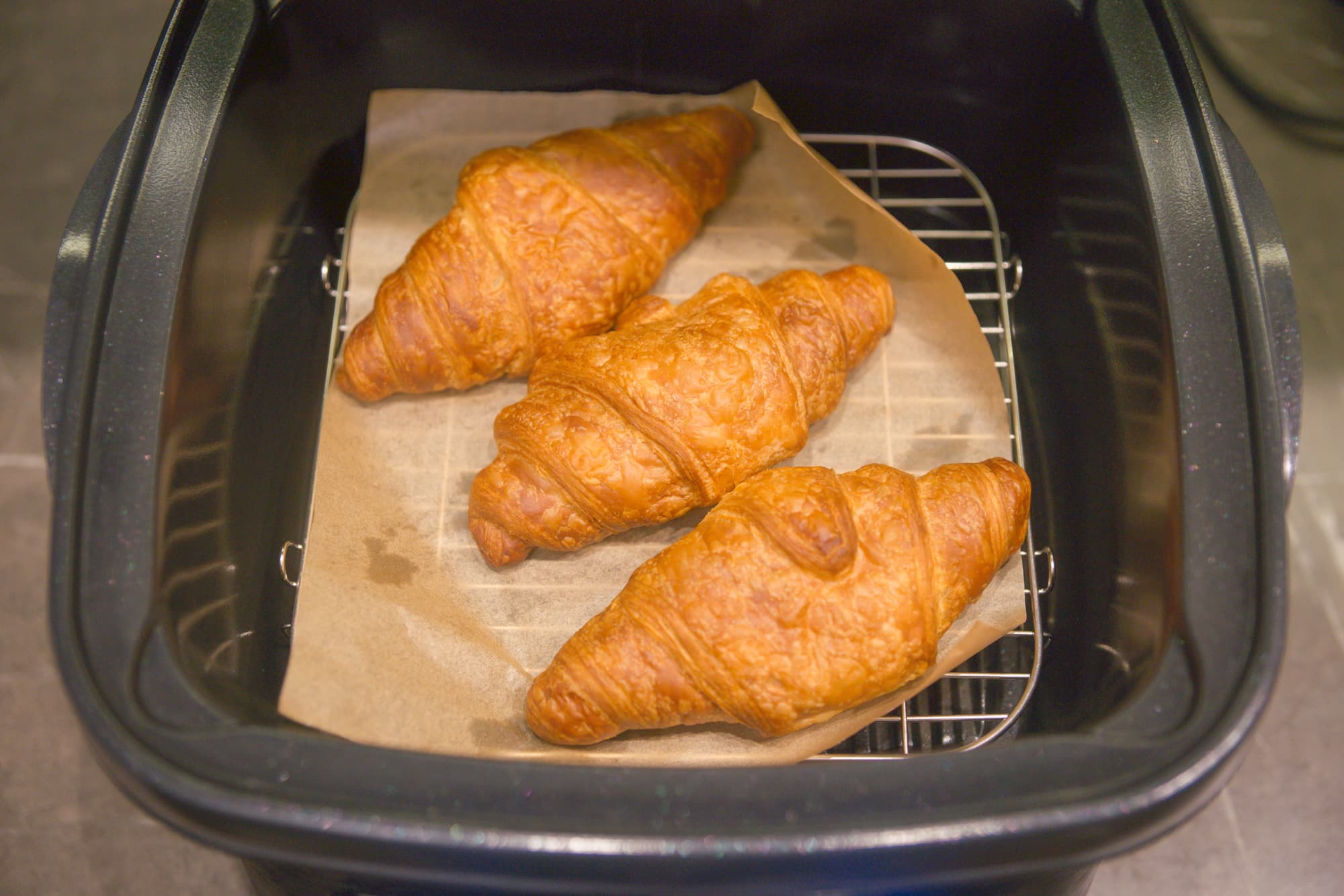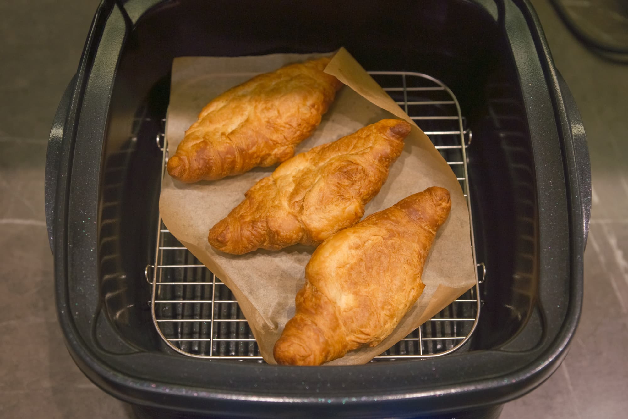 Напоследок мы решили проверить способность аэрогриля к выпечке. Круассаны выпекались в режиме Bake при 180 °C в течение 25 минут. Слоеные изделия быстро набирали объем и уже через 5 минут после запуска начали подрумяниваться. По правилам так делать не рекомендуется, но в середине процесса нам пришлось открыть крышку и перевернуть изделия, иначе снизу они так и остались бы бледными.
