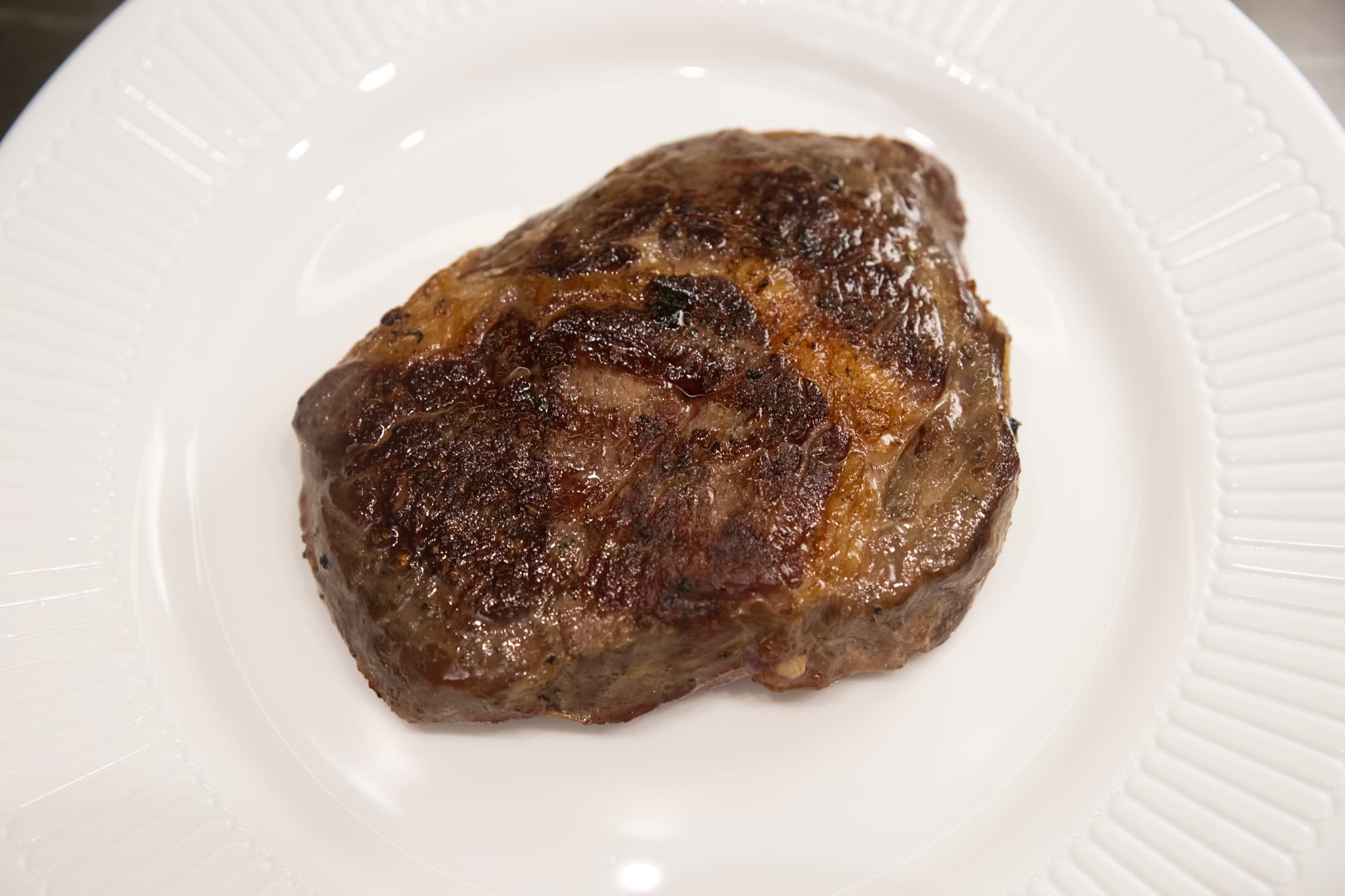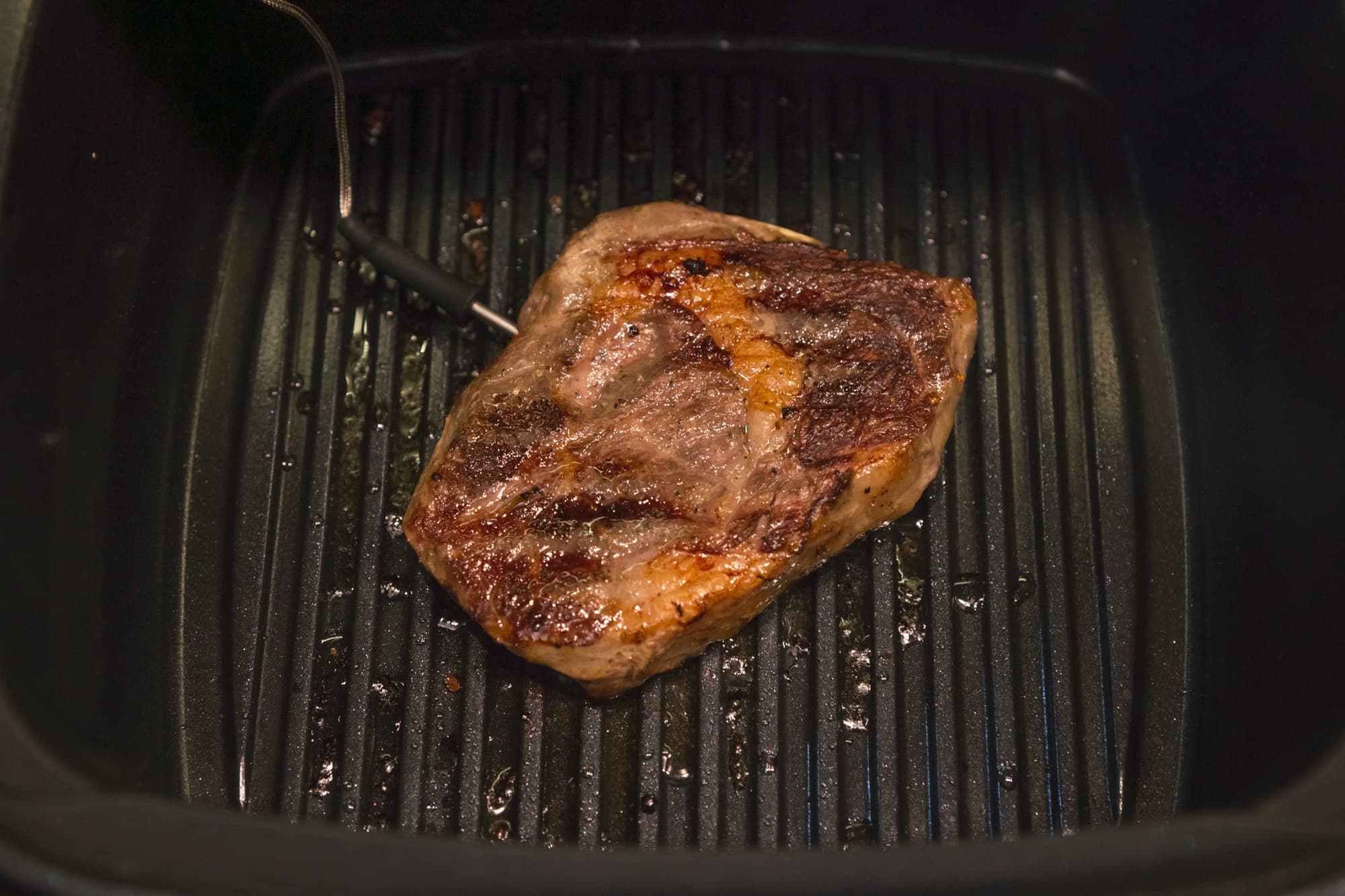 Обжарили мясо в режиме Grill на максимальной температуре с термощупом. Для стейка мы выбрали четвертую степень прожарки (до 47 °C).