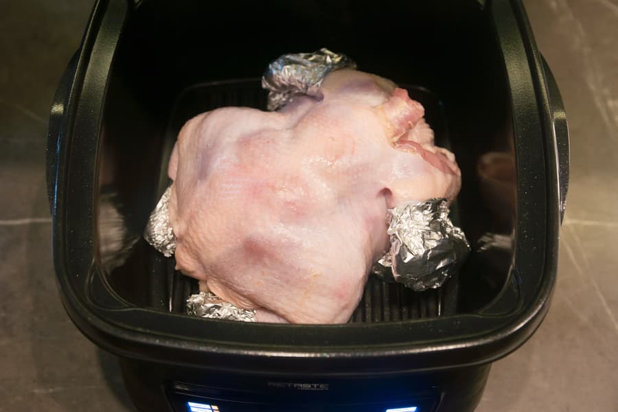 Курицу натерли солью и растительным маслом. Обернули крылышки и ножки фольгой, чтобы не подгорели, и опустили в чашу, предварительно разогретую в режиме Roast при 170 °C.
