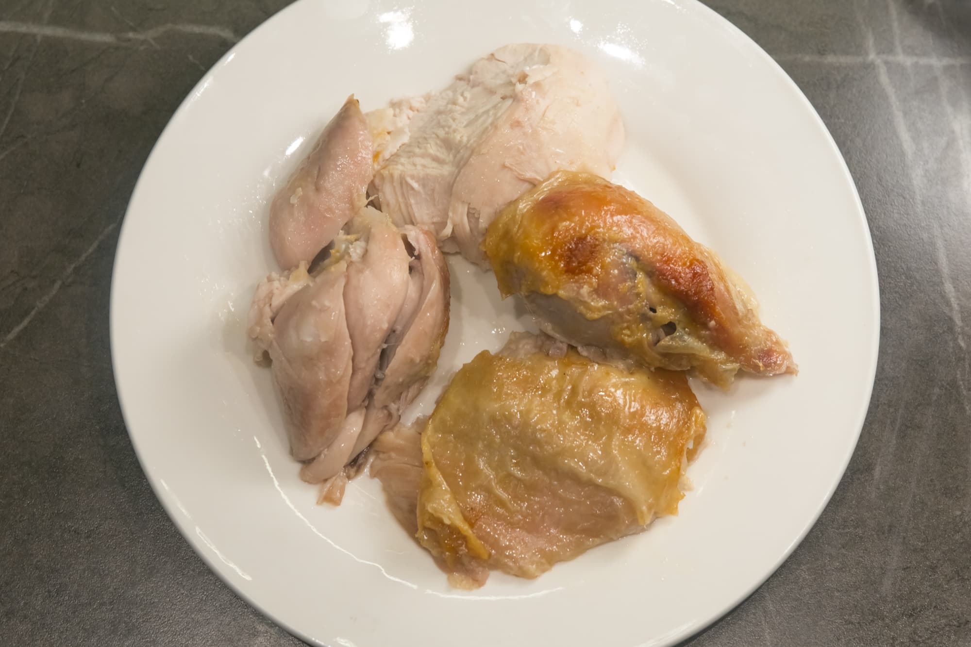 Через 13 минут бульон закипел, мы сняли пенку и переключили гриль в режим Slow cook. У него три уровня нагрева. Начали с первого. Для контроля температуры жидкости опустили в чашу проверенный сторонний термощуп. Выяснилось, что на 1-м уровне бульон готовился при 85 °C, на 2-м уровне — при 87 °C, и лишь на 3-м уровне мы наконец увидели нужные нам 90—95 °C. Что любопытно, на первых двух уровнях колебаний температуры почти нет, максимум на 1 °C, и то изредка. Более-менее цифра меняется только на 3-м, но в пределах допустимой для бульона нормы. Гриль проработал в этом режиме 2 часа. За это время мы получили крепкий ароматный бульон и отлично протомившееся мясо, легко распадающееся на волокна.