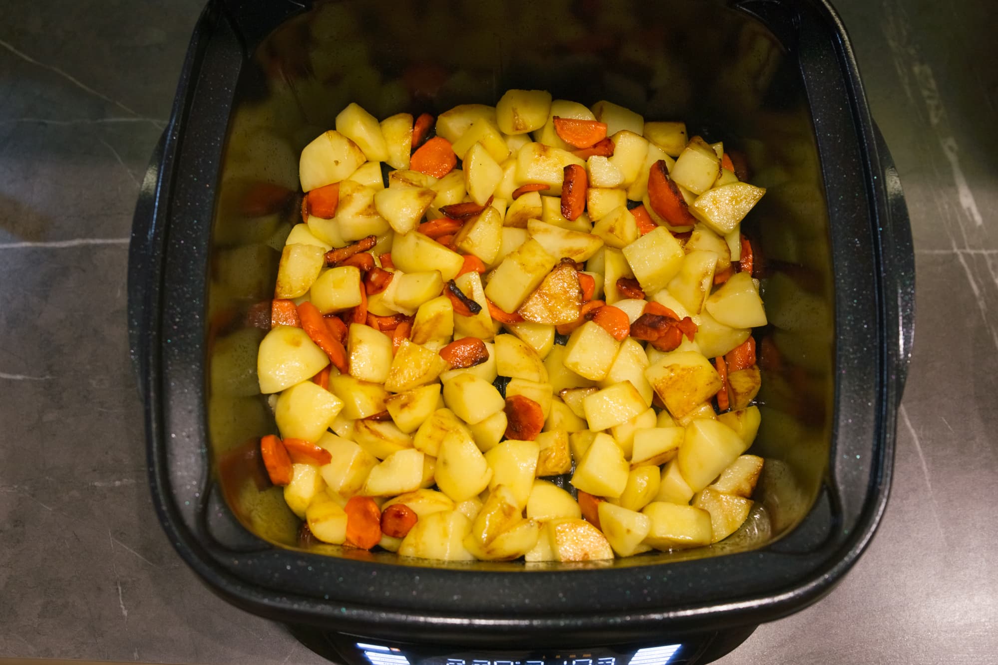 Затем отдельно была обжарена индейка весом 800 г. Объем ингредиентов приводим для понимания масштабов чаши. К концу обжаривания птицы соединили все ингредиенты, посолили, добавили специи, дольки чеснока, перемешали и вот теперь уже поменяли режим на Roast.