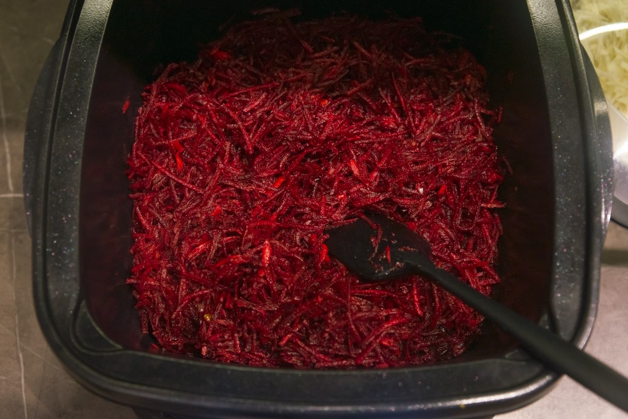 Дальше в режиме Manual при постоянном перемешивании обжарили лук с морковью, затем добавили к ним тертую свеклу, давленный чеснок, присыпали черным молотым перцем и солью.