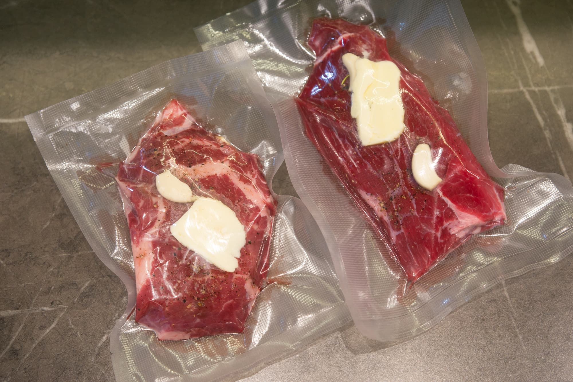 Натерли мясо солью с черным молотым перцем, добавили к каждой порции дольки чеснока, по кусочку сливочного масла, по веточке свежего розмарина и вакуумировали.
