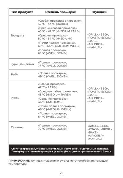В процессе степень прожарки можно изменить. Как только термощуп зафиксирует заданный уровень нагрева, аэрогриль самостоятельно отключится.