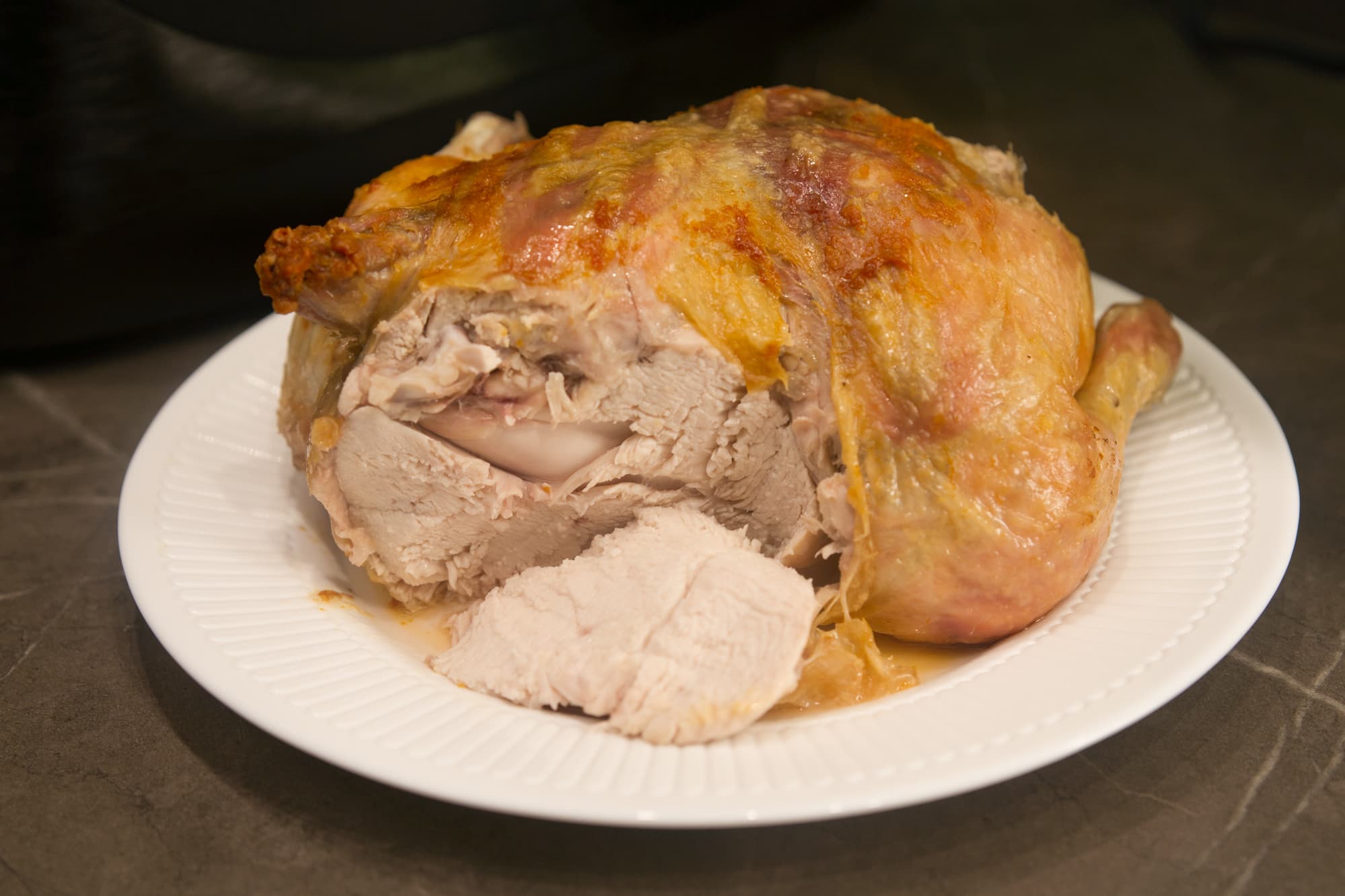 Для контроля температуры воткнули в курицу термощуп. Через 30 минут он зафиксировал необходимую температуру и отключил нагрев.