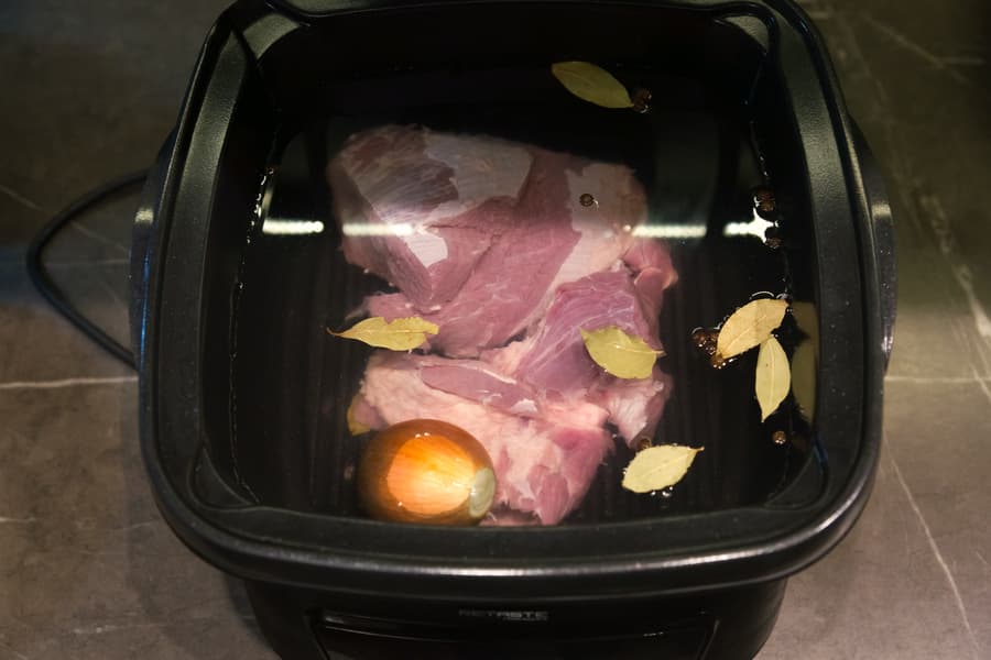 Опустили заготовки в чашу, налили воду до максимальной отметки и включили режим Sous Vide с нагревом в 64 °C. На самом деле нам были нужны 58 °C, но мы проводили измерения заранее и выяснилось, что аэрогриль недогревает до заданного уровня как раз 5-6 °C. Так как мы уже знали, что вода до этой температуры нагревается в чаше в течение получаса, а томить мясо мы планировали 8 часов, выставили 8,5.