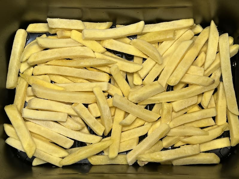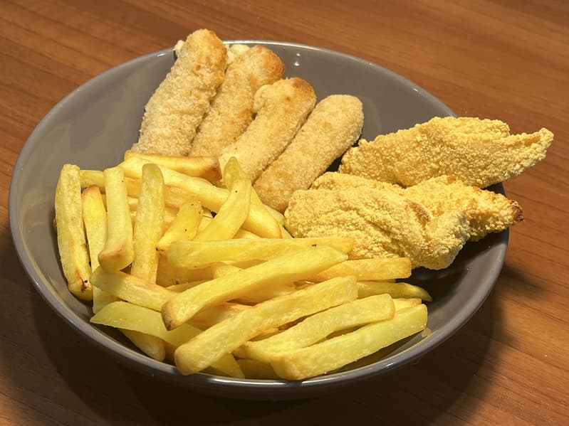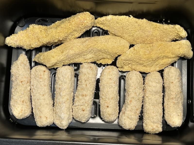 В данном тесте мы готовили закуски параллельно: картофель-фри — в левом лотке, куриные стрипсы и сырные палочки — в правом.