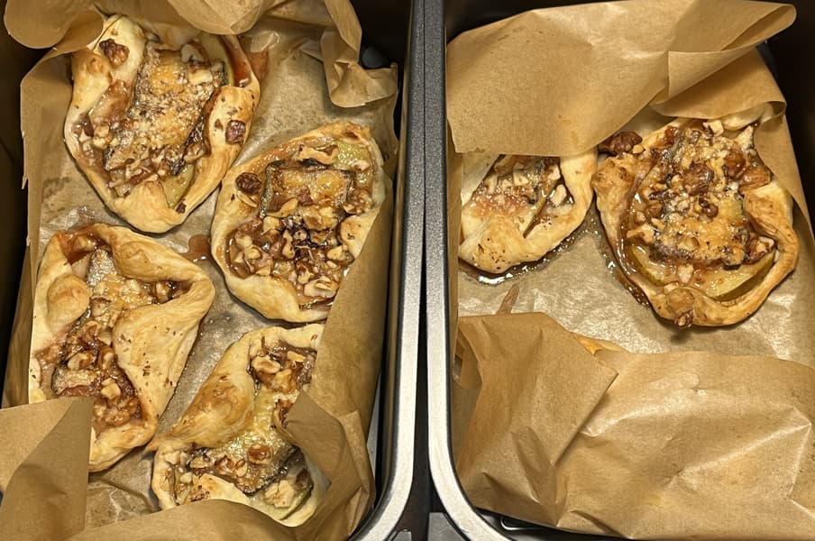 Нашим третьим тестом стали быстрые слойки с грушей, козьим сыром с белой плесенью и грецким орехом. Такой десерт сочетает в себе много разных вкусовых оттенков и отлично подходит к чаю, кофе и белому вину.