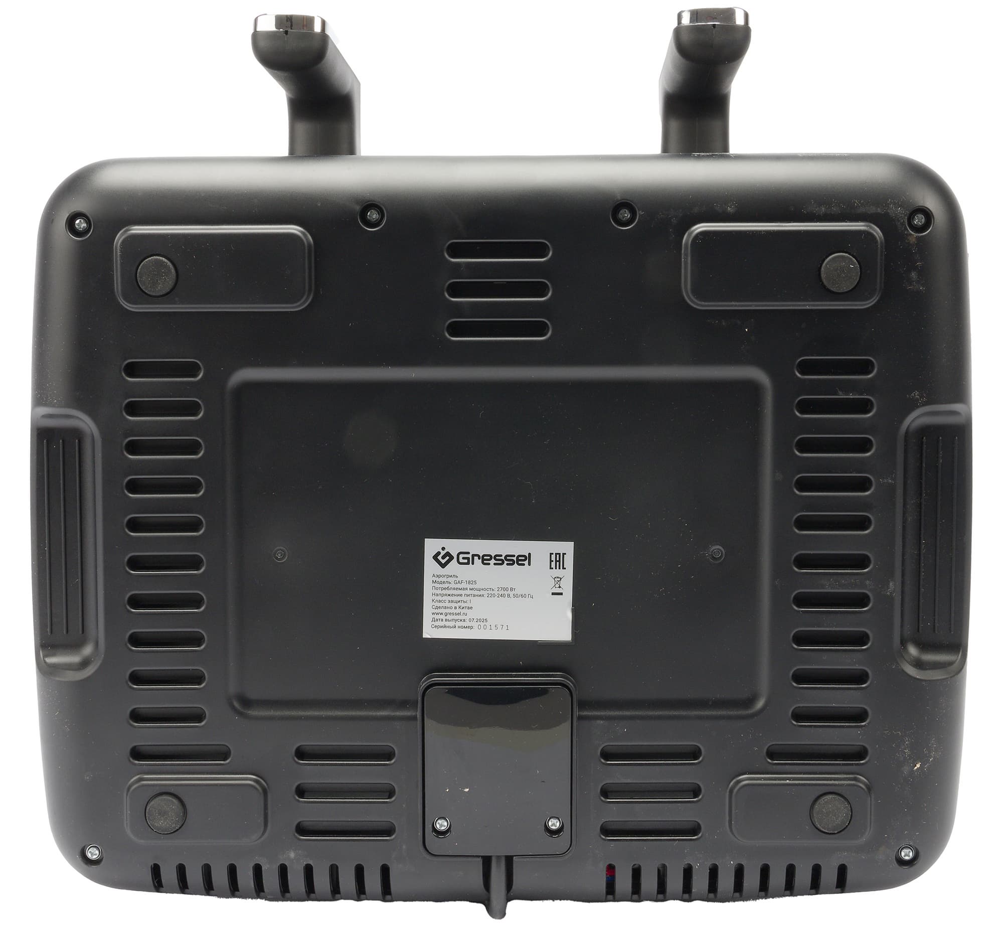Аэрогриль имеет четыре небольшие прорезиненные ножки. Наклейка с серийным номером и основными характеристиками также находится на дне устройства.