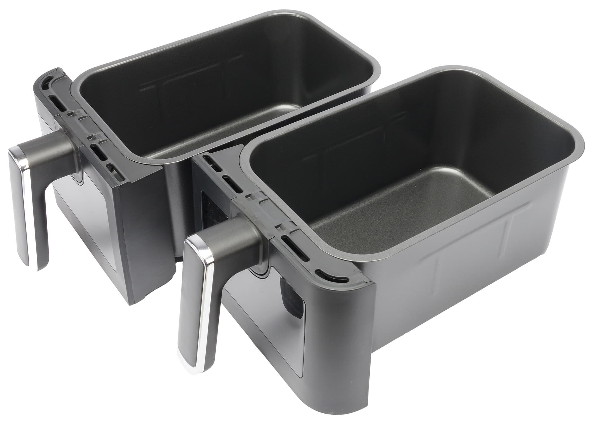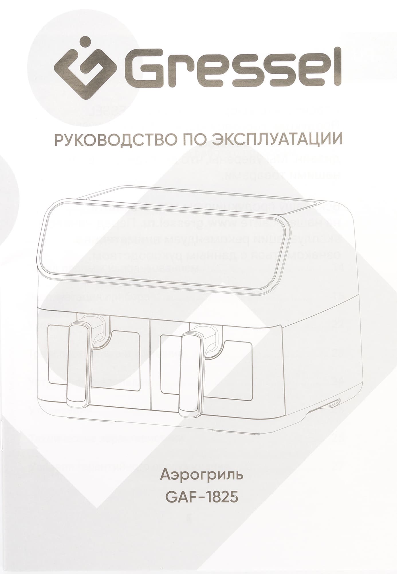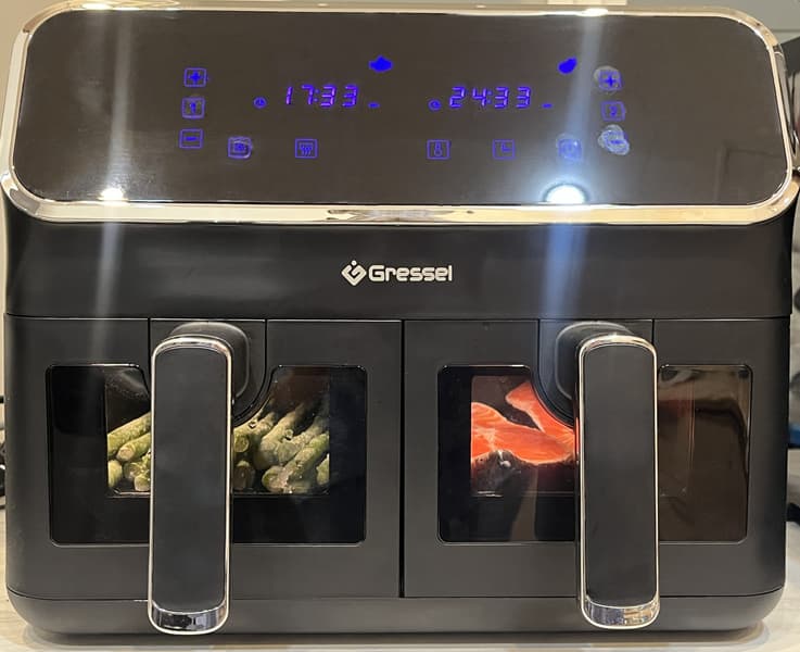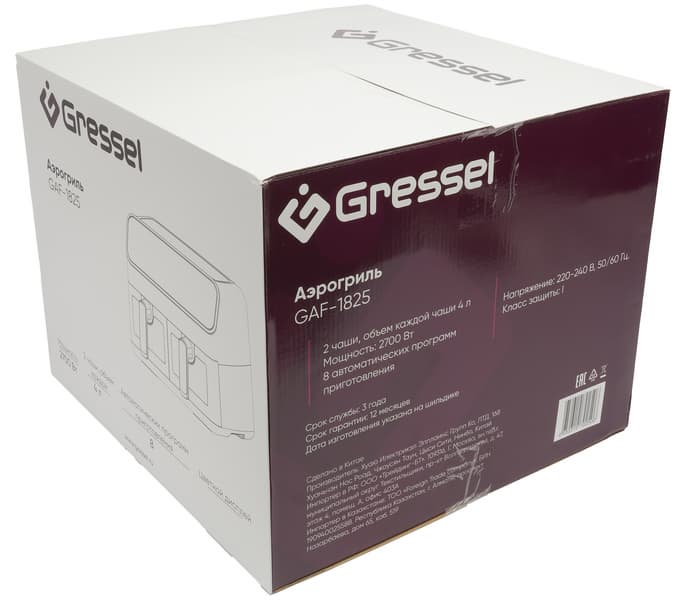 Аэрогриль Gressel GAF-1825 — это мощный (2700 Вт) прибор с двумя чашами по 4 литра, сенсорным управлением и девятью программами. Температура всех программ регулируется в диапазоне от 80 до 200 °C, а время готовки может быть задано до 60 минут. Формат с двумя раздельными чашами позволяет как готовить разные блюда, например мясо и гарнир, одновременно, так и использовать лишь одну чашу для небольших порций (либо готовить двойную порцию, используя оба отсека для одних и тех же ингредиентов).