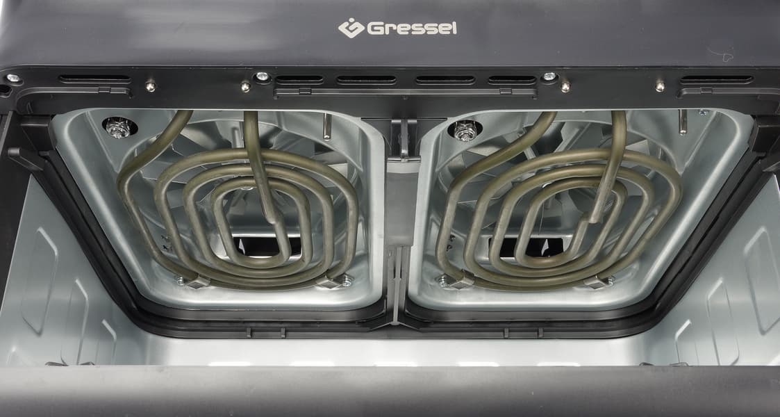 Нагревательные элементы расположены внутри камеры сверху, если специально не заглядывать, их не видно. Над ними находятся вентиляторы, которые создают воздушные потоки от нагретого тэна.