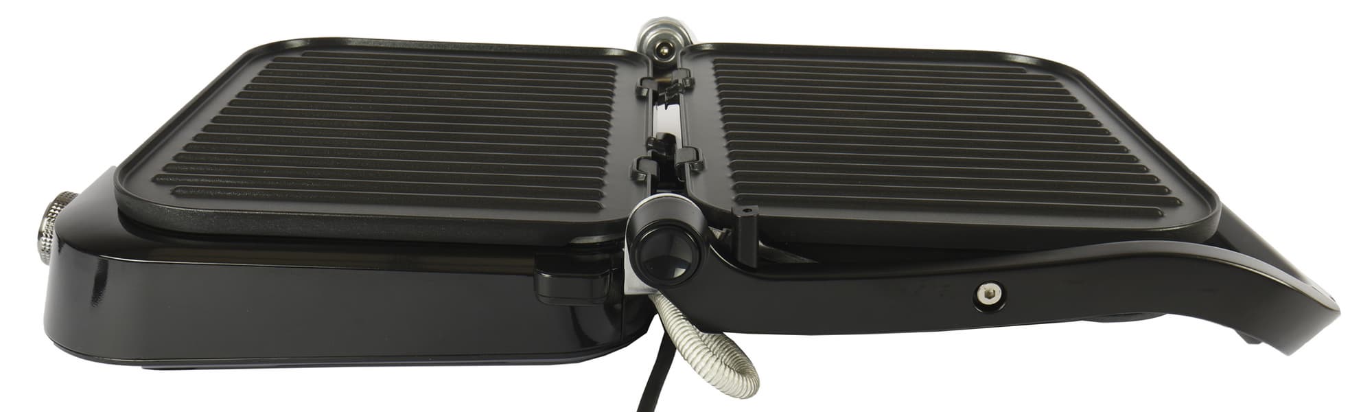 Как несложно догадаться, возможность работы с такой формой подразумевает, что верхняя панель у данной модели «плавающая», то есть всегда располагается параллельно нижней вне зависимости от толщины установленной формы (или куска мяса). Это хорошо: таким образом обеспечивается лучший контакт с продуктом, а следовательно — более равномерная прожарка.