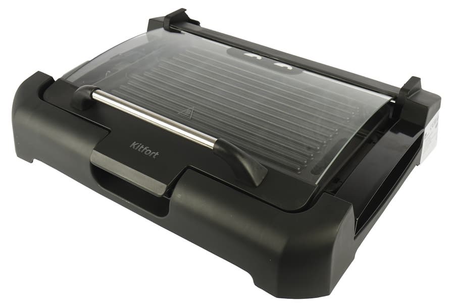 Простой, лаконичный корпус Kitfort KT-1673 выполнен из матового термостойкого пластика и дополнен съемной крышкой из закаленного стекла. Корпус прибора больше, чем у стандартного прижимного гриля и потребует немало места на поверхности кухонного стола. Ширина устройства — 50 см, глубина — 39 см. С подключенным регулятором температуры гриль в ширину займет 60 см.