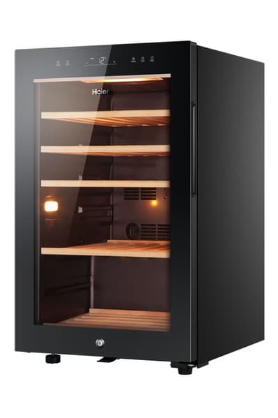 У винного шкафа Haier FWC49GA строгий дизайн. В оформлении корпуса и дверцы преобладает черный цвет, настраивающий на серьезный лад.