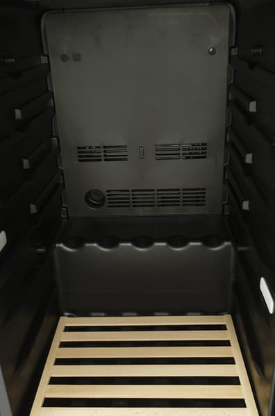 В нижней части камеры можно видеть «ступеньку», за которой скрывается холодильный агрегат. В круглом отверстии в левом нижнем углу размещен цилиндрический фильтр с наполнителем из активированного угля, предназначенный для борьбы с неприятными запахами.